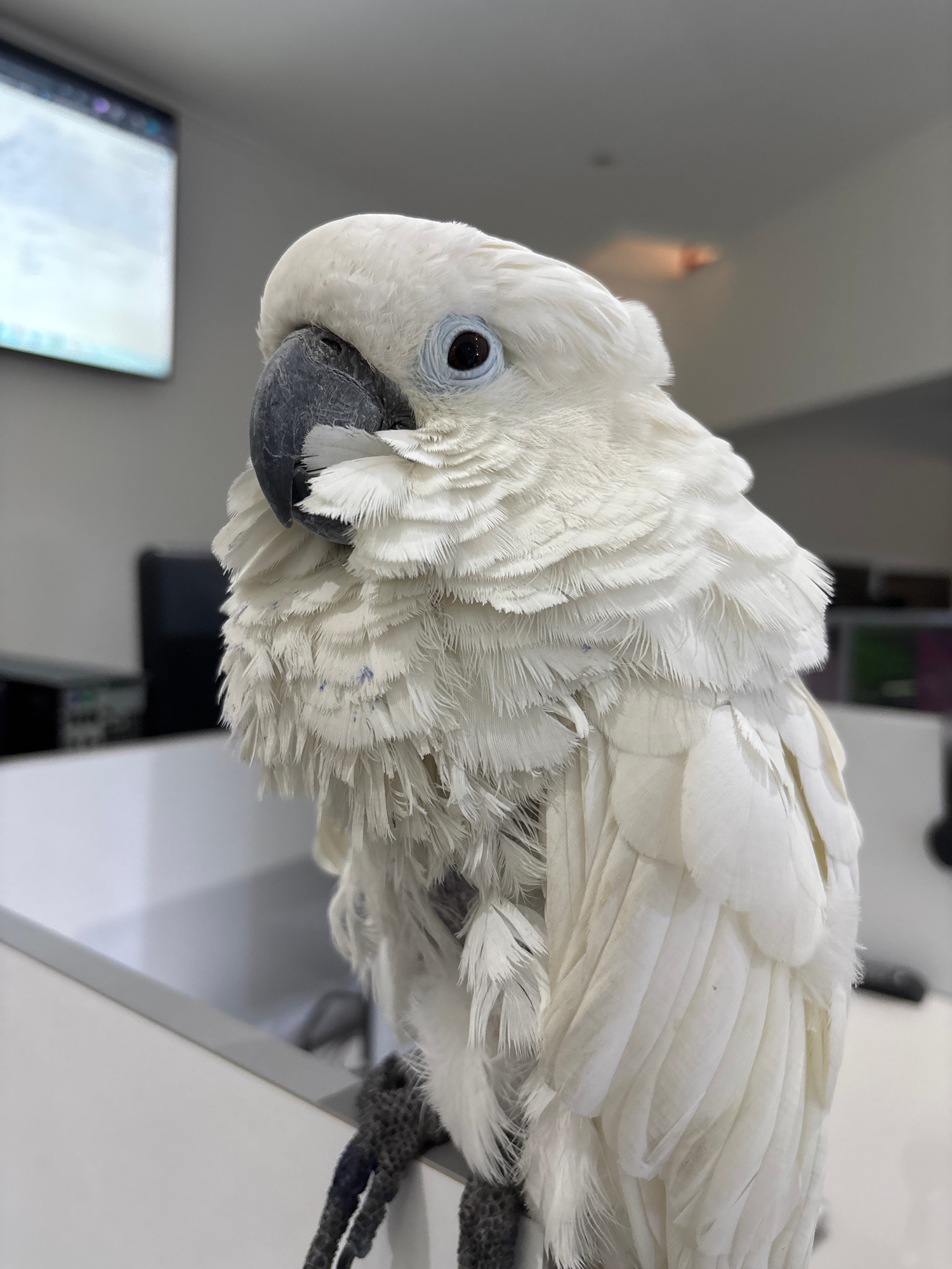 A white cockatoo is depicted in a medium close-up, perched on a white horizontal surface in an indoor setting. The bird features predominantly white feathers, with a dark grey beak and dark eyes frame…read more