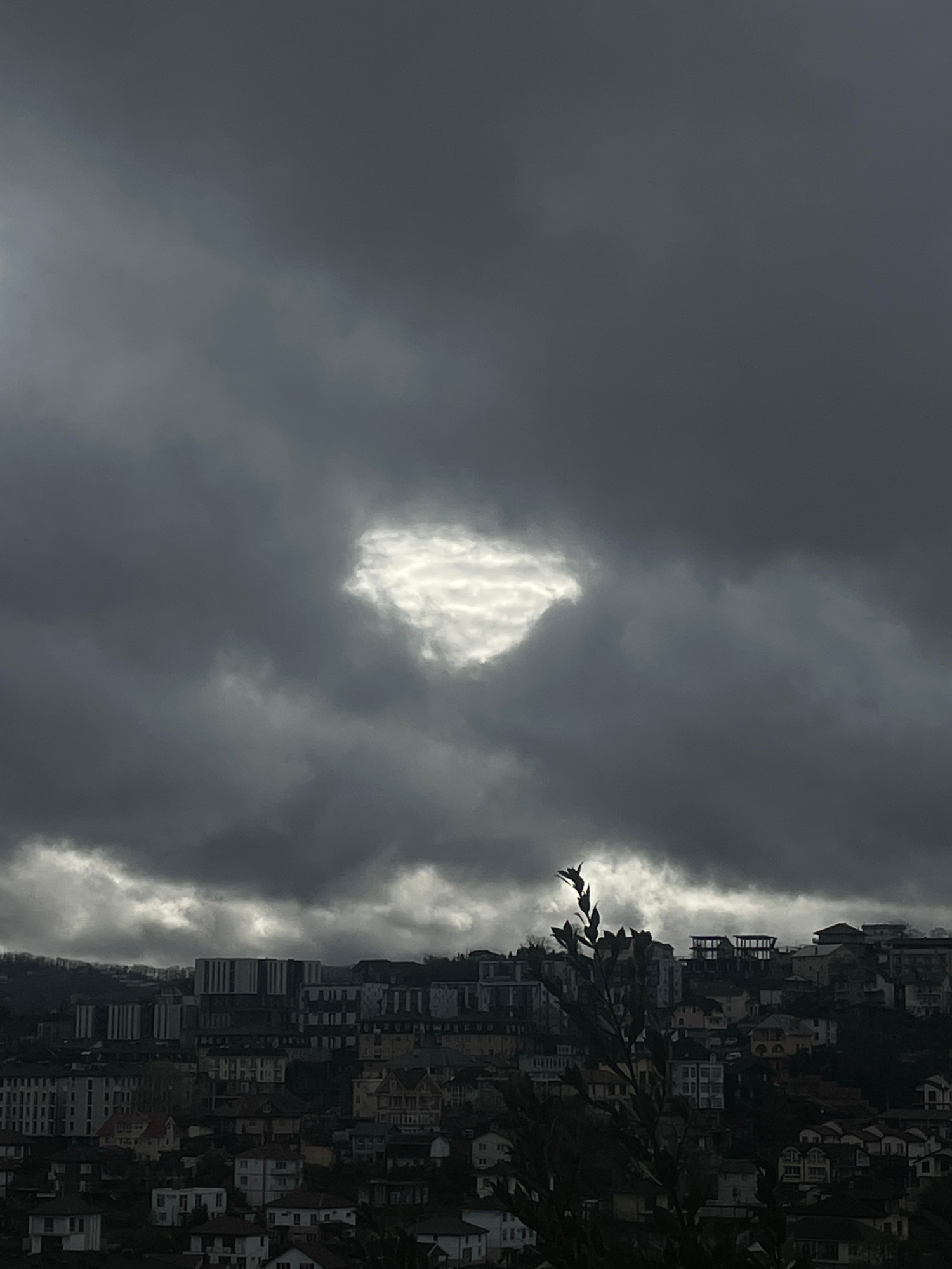 Overcast day in Sochi, Russia. Tall buildings are stacked on a hillside beneath a dark, cloudy sky with a single patch of white. A few branches are visible in the foreground.