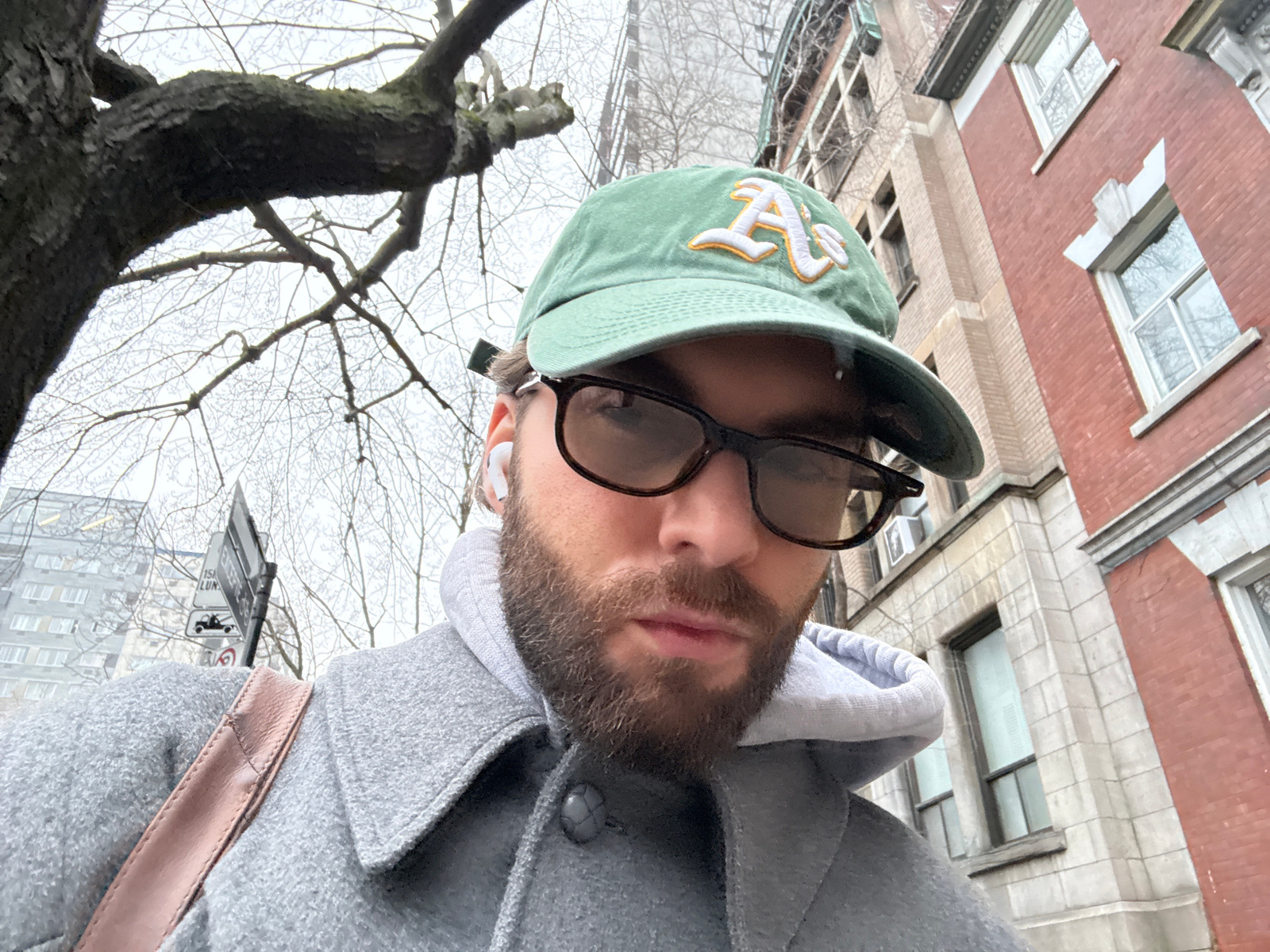 The image shows a person wearing a light green baseball cap with a stylized white and yellow "A's" logo, glasses, a gray coat with a hood, and an earpiece. The person has a beard and fair skin. The b…read more