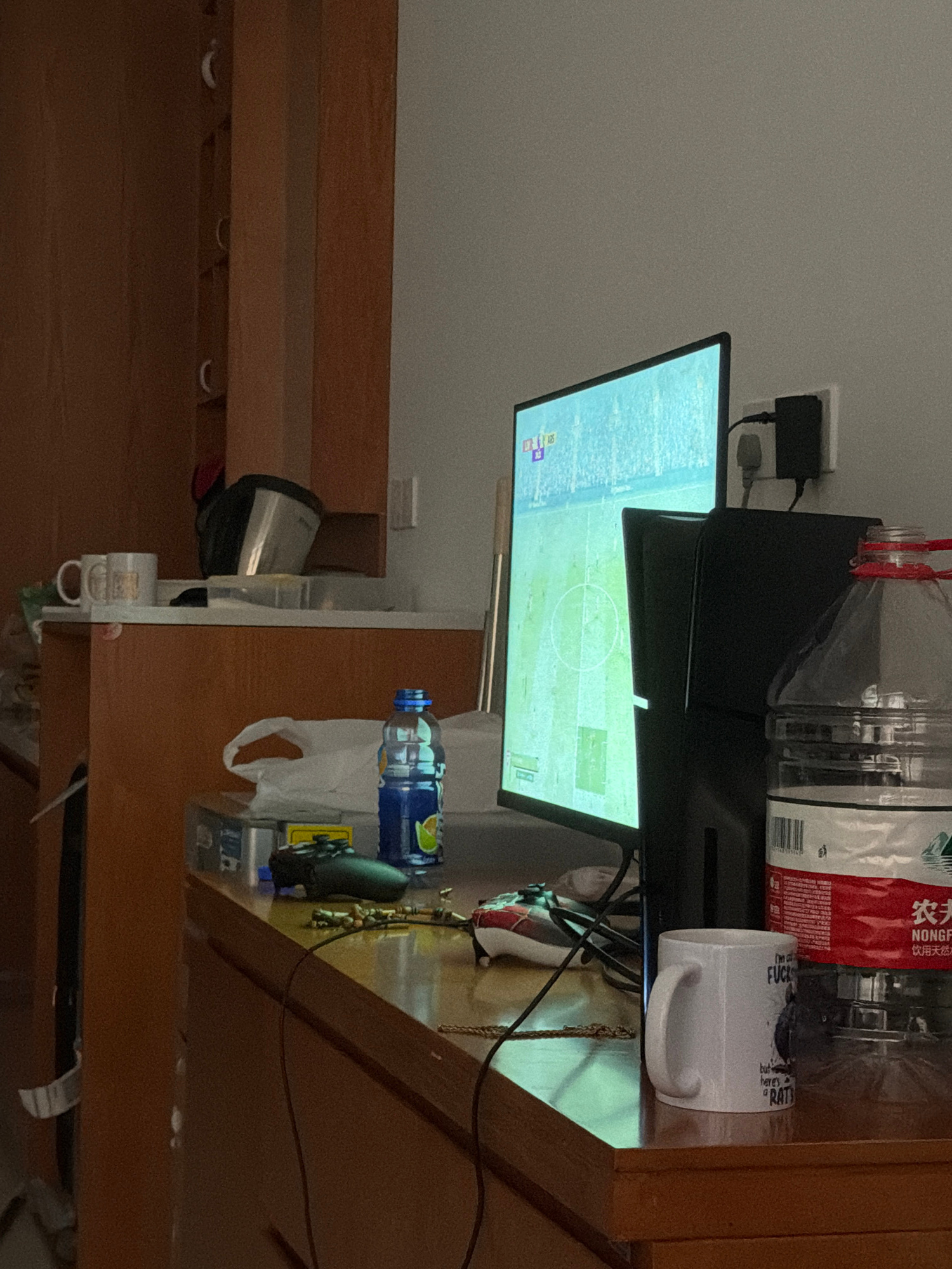 This indoor scene features a computer monitor displaying a soccer game. A black computer tower is positioned behind the monitor. Beside the monitor rests a white mug with bold lettering. A clear plast…read more