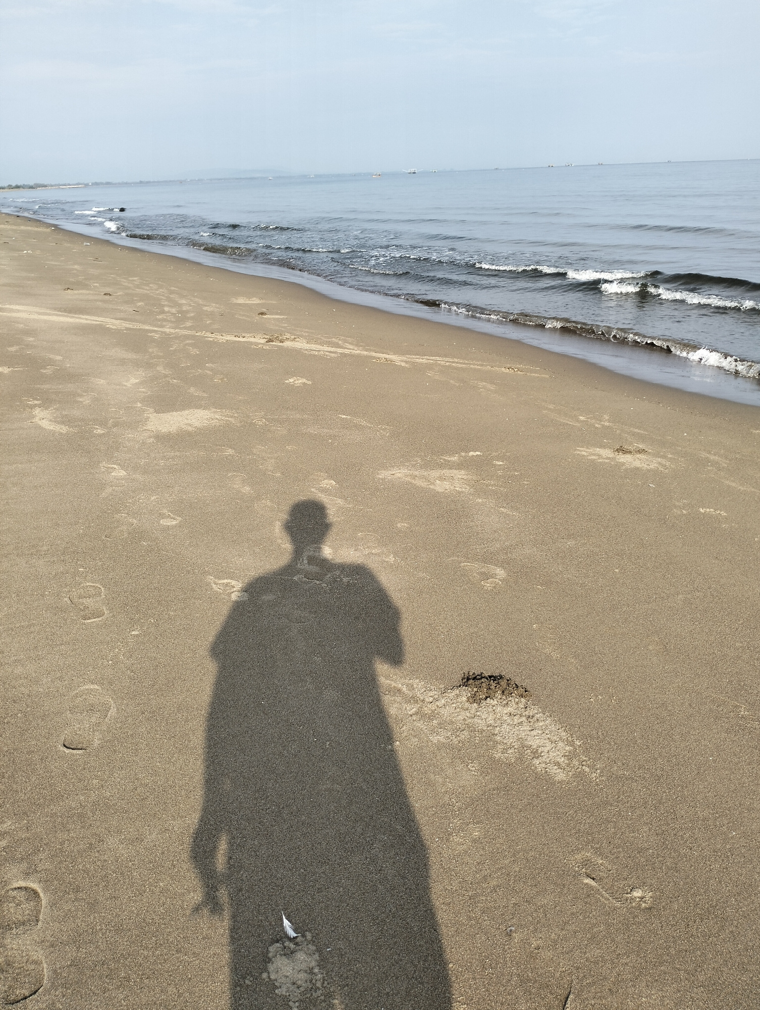 The scene depicts a sandy beach located in Curehtunong, Indonesia. A shadow of a person is cast in the foreground. The beach stretches to the horizon where the ocean meets the sky. Small waves are vis…read more