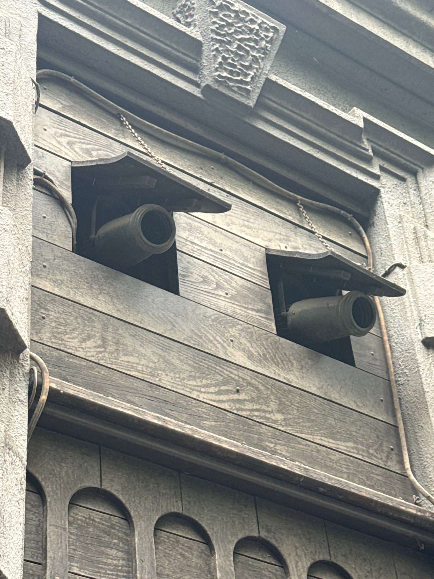 The image depicts two cannons positioned behind wooden shutters in Zagreb, Croatia. The cannons are a dark, metallic color, possibly a weathered gray or green, and are aimed downwards from their respe…read more
