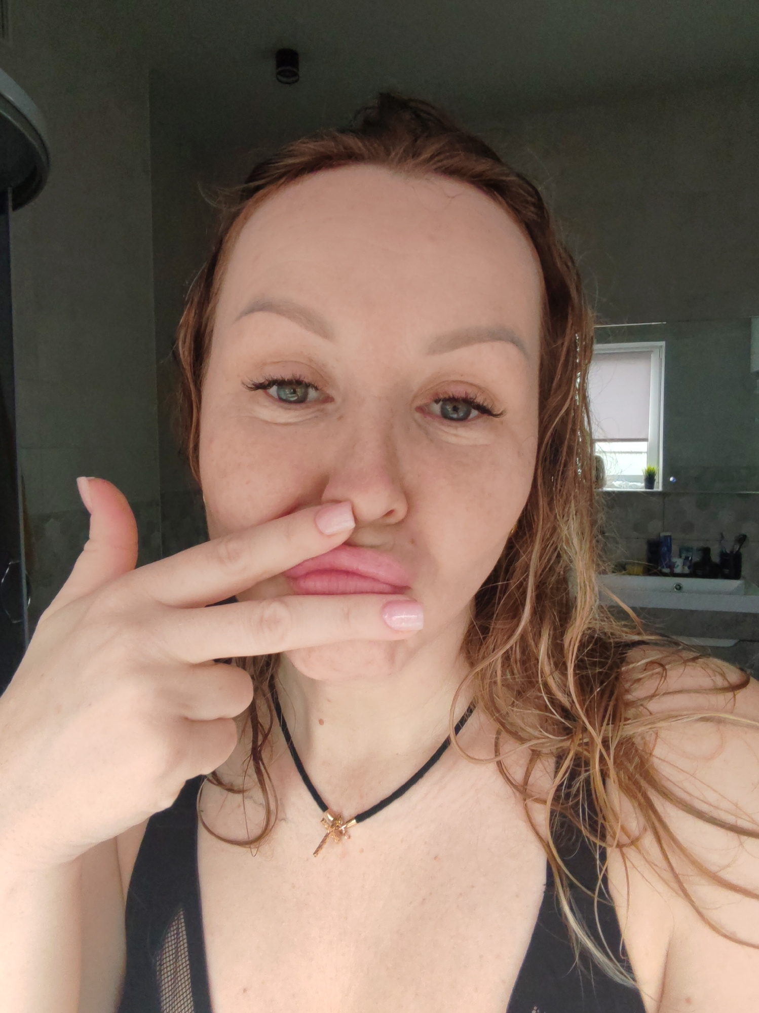A woman is posing indoors, likely in a bathroom, based on the presence of a sink and mirror visible in the background. She has light skin, reddish-blonde wet hair, and is wearing a black top and a bla…read more