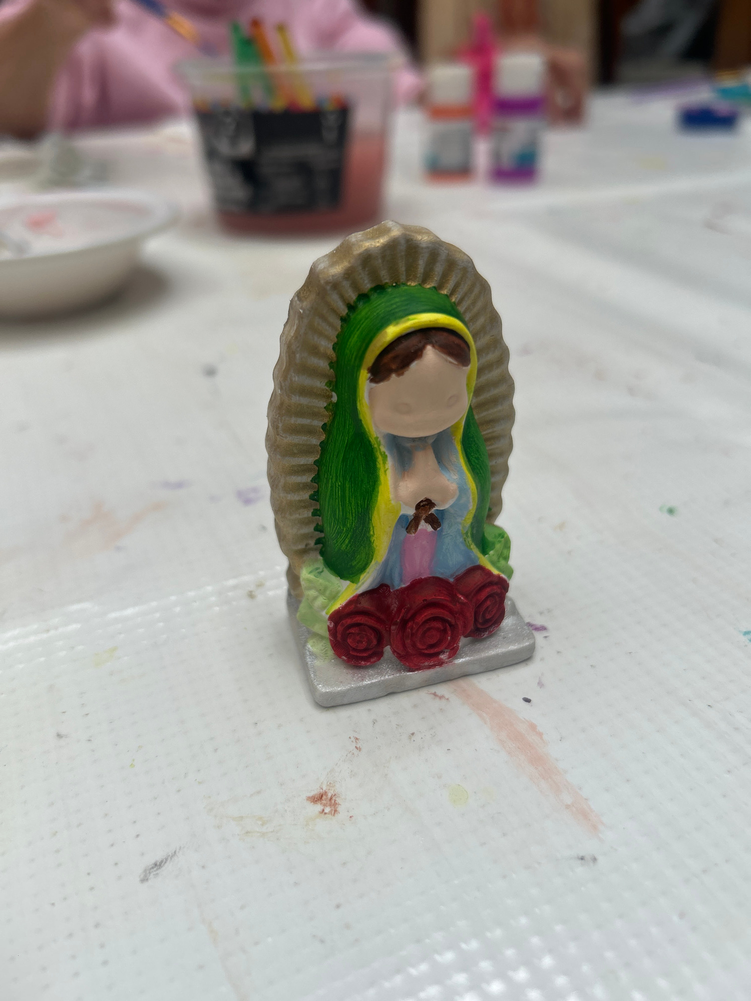A figurine of the Virgin of Guadalupe lies on a white, textured surface. The figure is predominantly light tan with accents of green, gold, red, and blue. The setting is likely indoors, but the specif…read more
