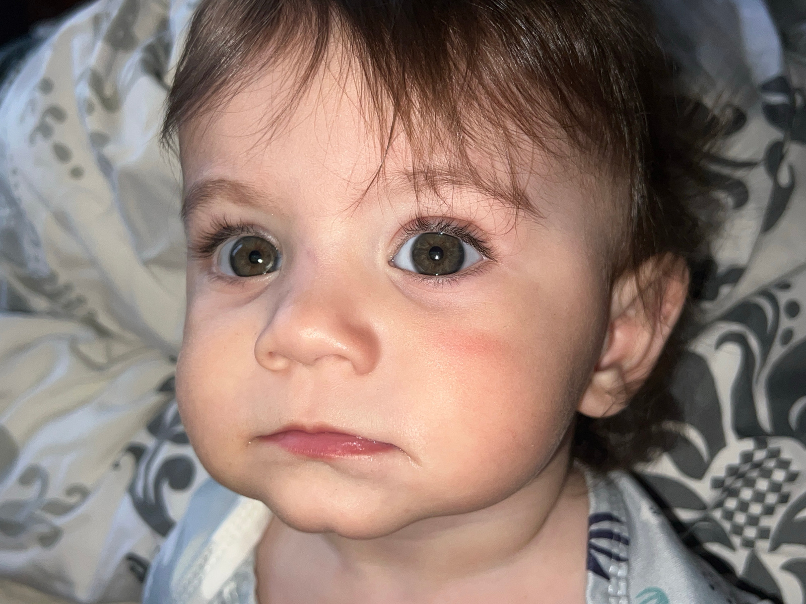 A close-up portrait of a baby with brown hair and eyes. The baby has fair skin with a slight redness on the right cheek. The baby is looking directly at the camera with a somewhat serious expression.…read more