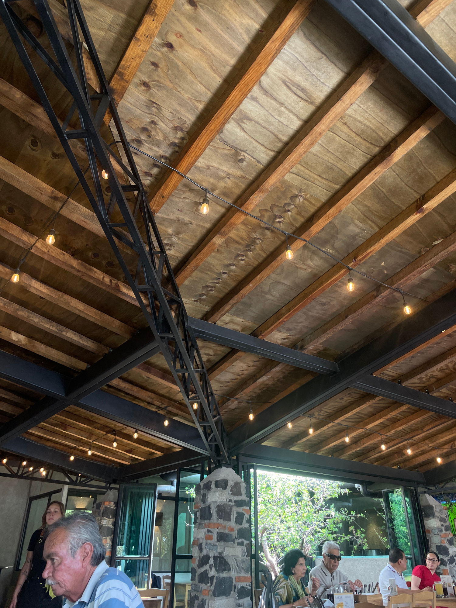 The image shows the interior of a restaurant located in Puebla, Mexico. A ceiling structure consisting of wooden beams reinforced by a black metal frame dominates the view. String lights hang from the…read more