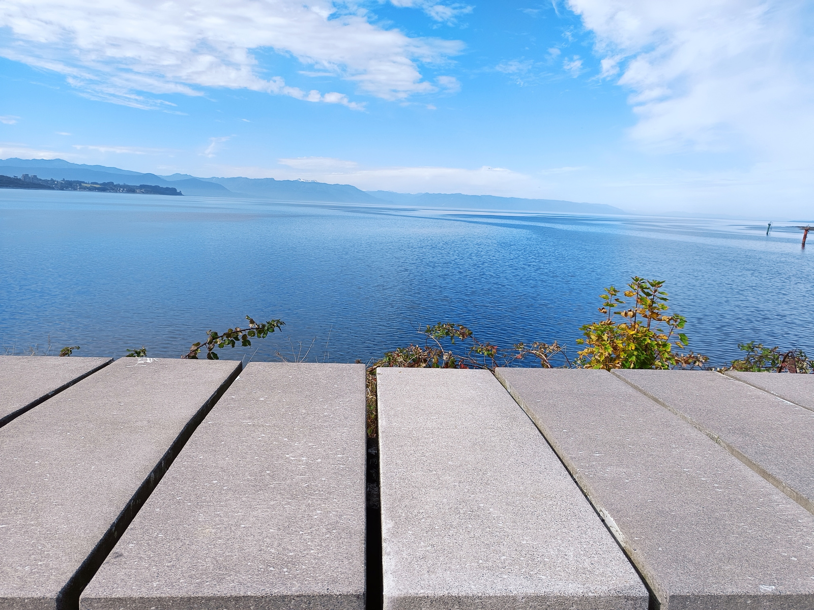 A landscape photograph captured in Puerto Montt, Chile, shows a body of water receding into the distance, framed by a bright blue sky dotted with clouds. A chain of mountains is seen on the horizon. I…read more