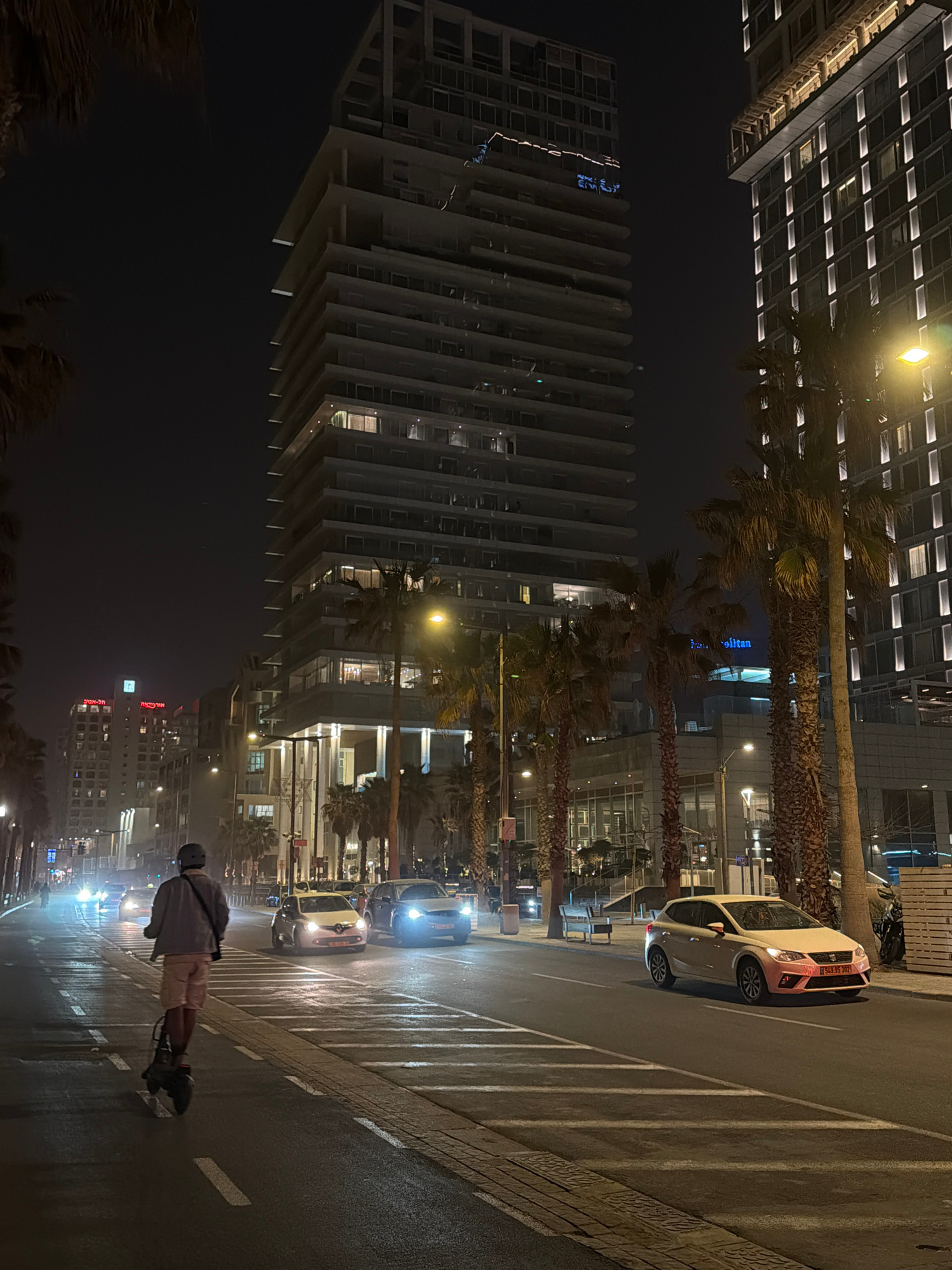 At night, the image depicts a scene in Tel Aviv, Israel. The lighting is dominated by streetlights. In the foreground, a person on roller skates is riding towards the horizon, on a road with streetlig…read more