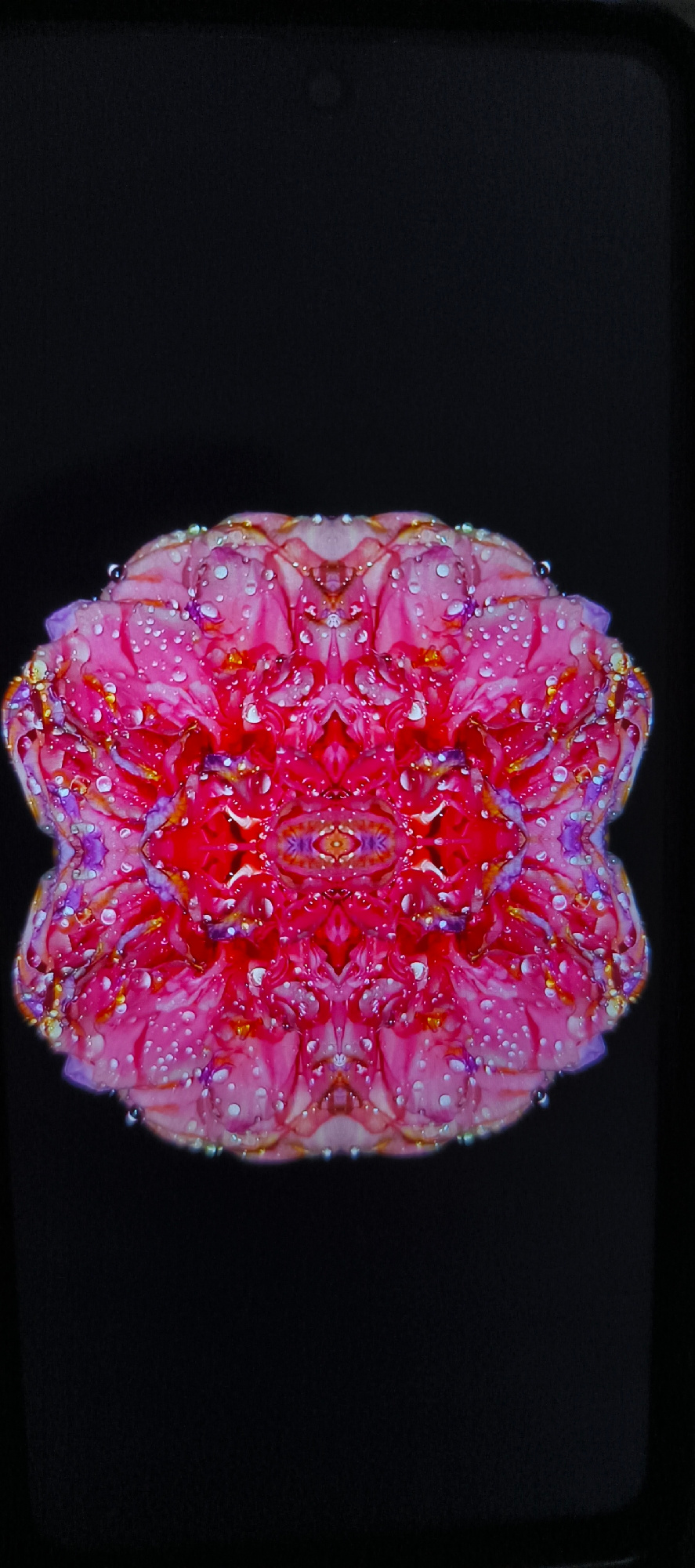 A mirrored image of a flower, possibly a zinnia, with water droplets on its petals is set against a black background. The flower is predominantly pink and red with hints of yellow and purple.