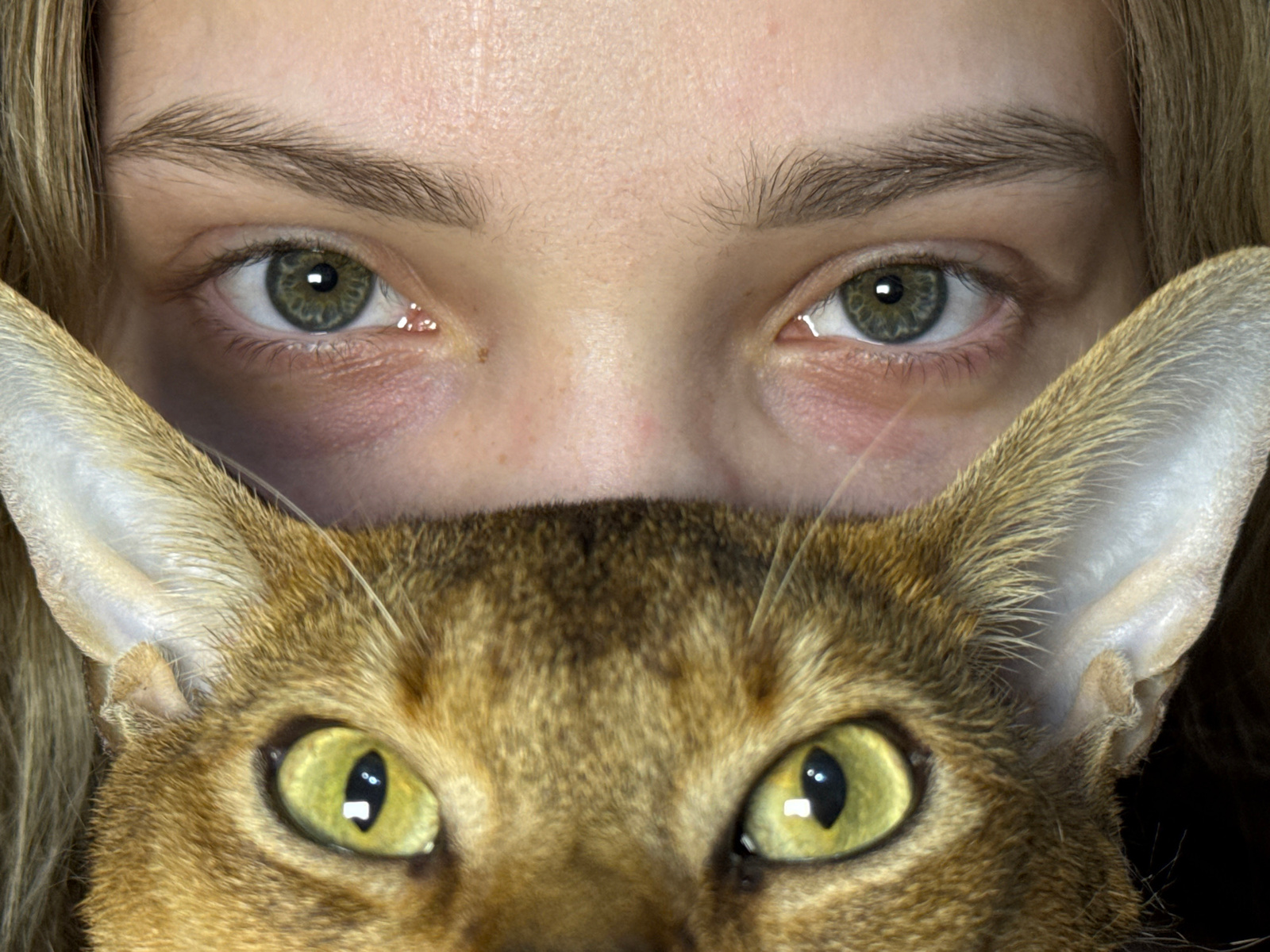The image shows a close-up of a person's face with a cat partially obscuring the lower half. The person has fair skin, green eyes, and blonde hair visible at the edges of the frame. Their eyebrows are…read more