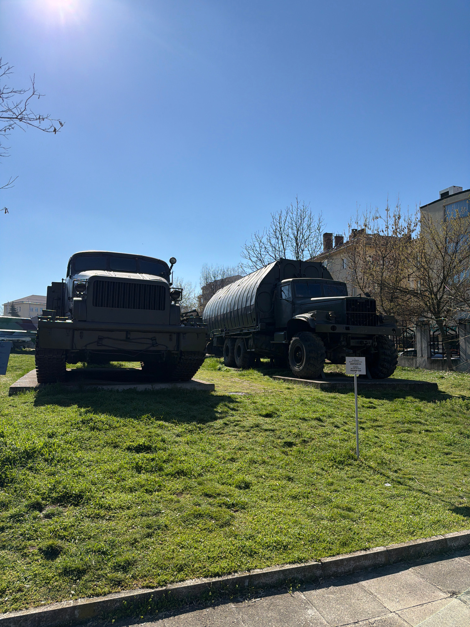 The image shows two military vehicles on display in an outdoor setting. The vehicles are dark green and appear to be trucks or transport vehicles. They are parked on a grassy area, likely a park or a…read more