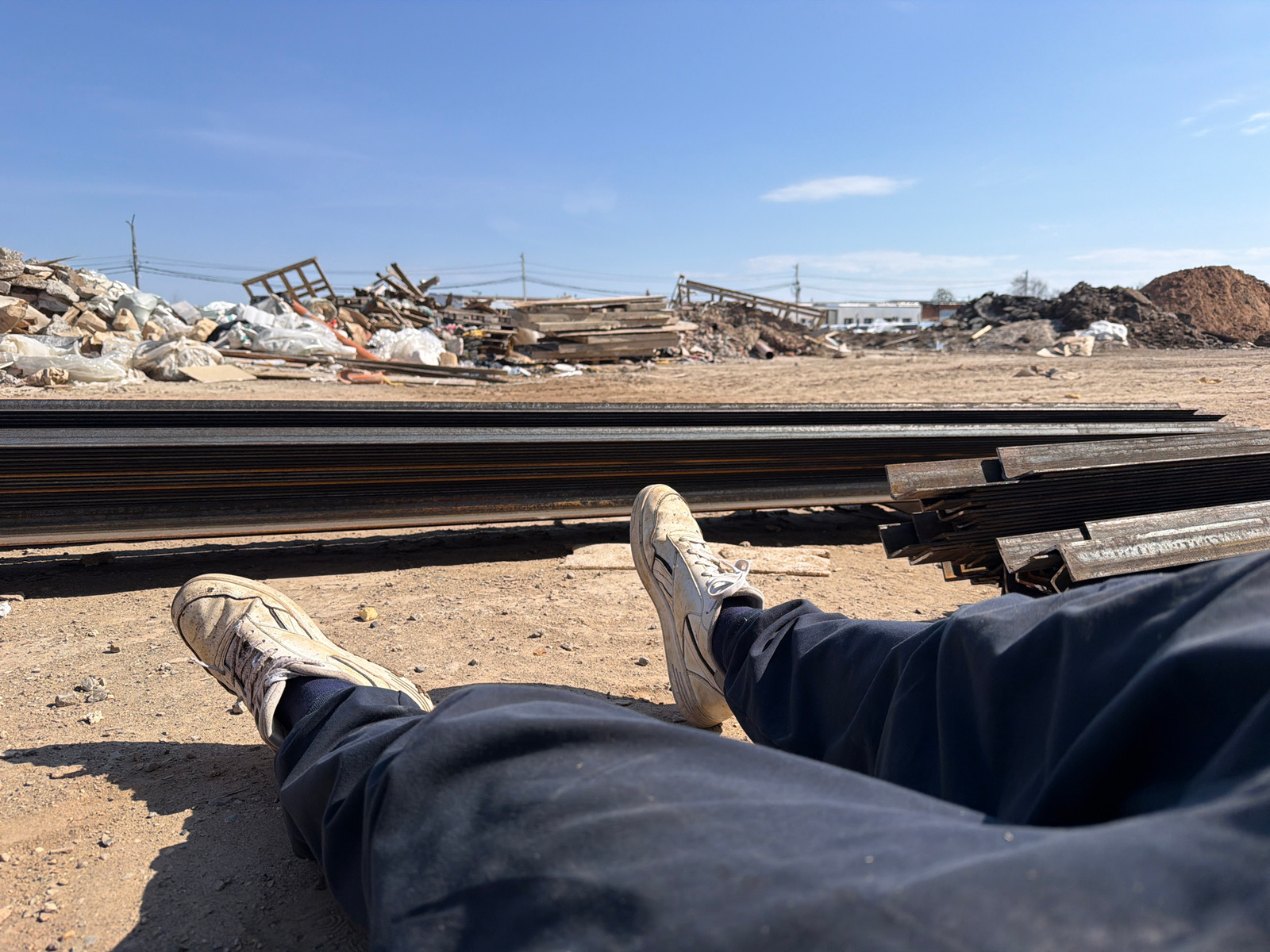 The image captures a first-person perspective of a person lying or sitting on dry, dusty ground at what appears to be an industrial or construction site in Chaikovsky, Russia. The legs of the individu…read more