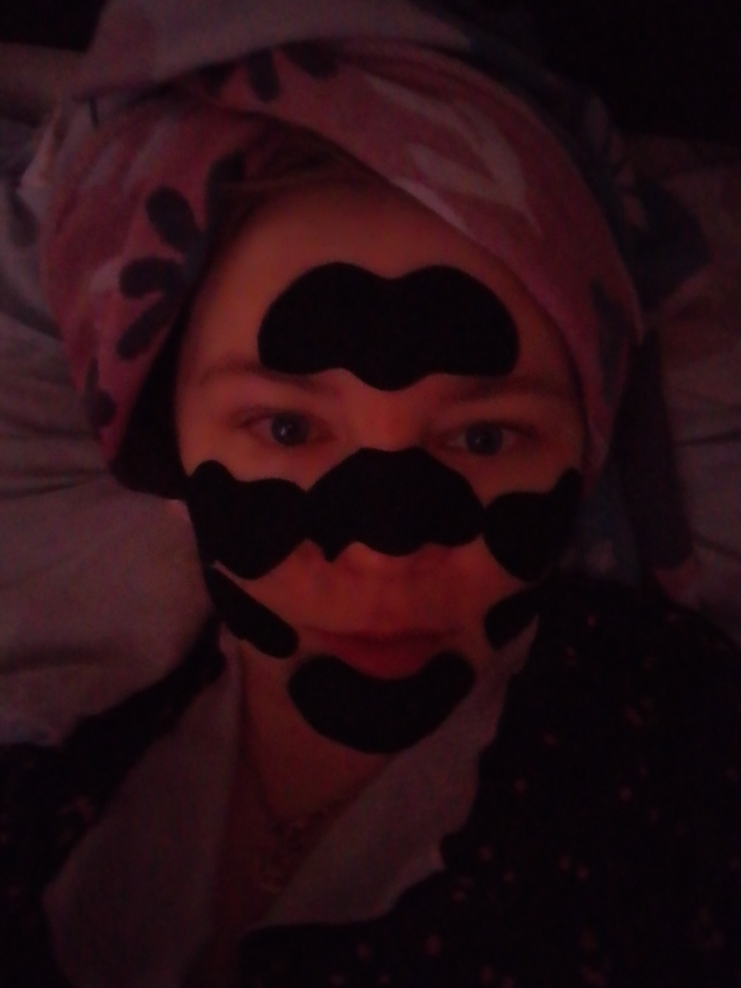 A woman is lying down, wearing a pink and black floral towel wrapped around her head, and multiple black adhesive strips on her face. The background appears to be bedding and possibly pajamas. The lig…read more
