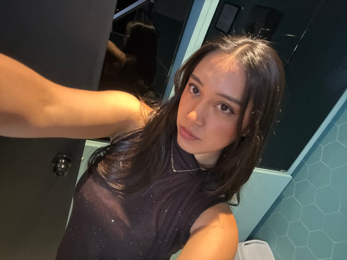A young adult female is depicted in a close-up selfie taken indoors. She has dark, shoulder-length hair with a middle part and is wearing a dark, sleeveless top with subtle glitter. A thin silver-colo…read more