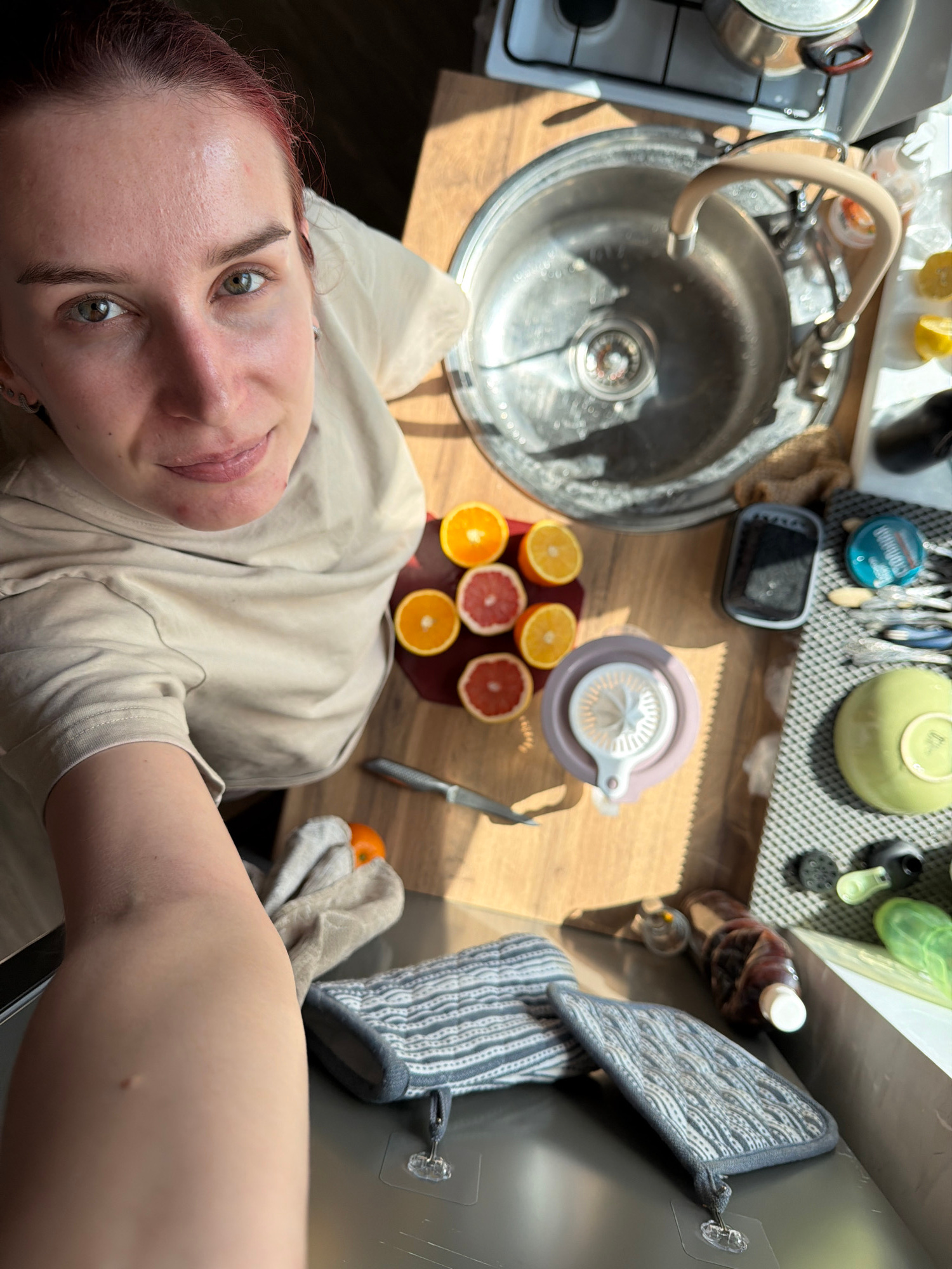 A woman is taking a selfie in what appears to be a kitchen. The kitchen features a stainless steel sink, a wooden countertop with halved oranges and grapefruits, a citrus juicer, and a knife. Other ki…read more