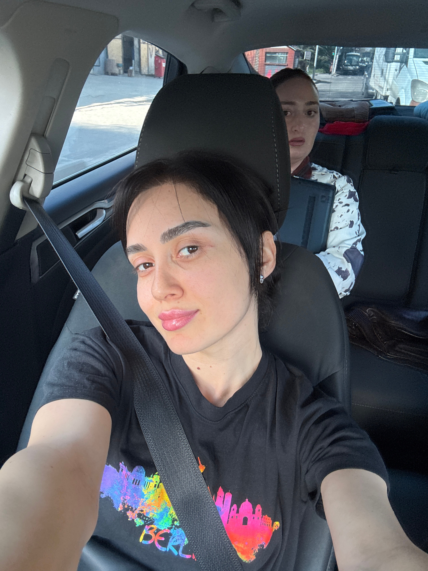 A photograph depicts a woman wearing a black T-shirt with a colorful design on the front and a seatbelt fastened across her chest, sitting in the front seat of a car. Another person is visible in the…read more