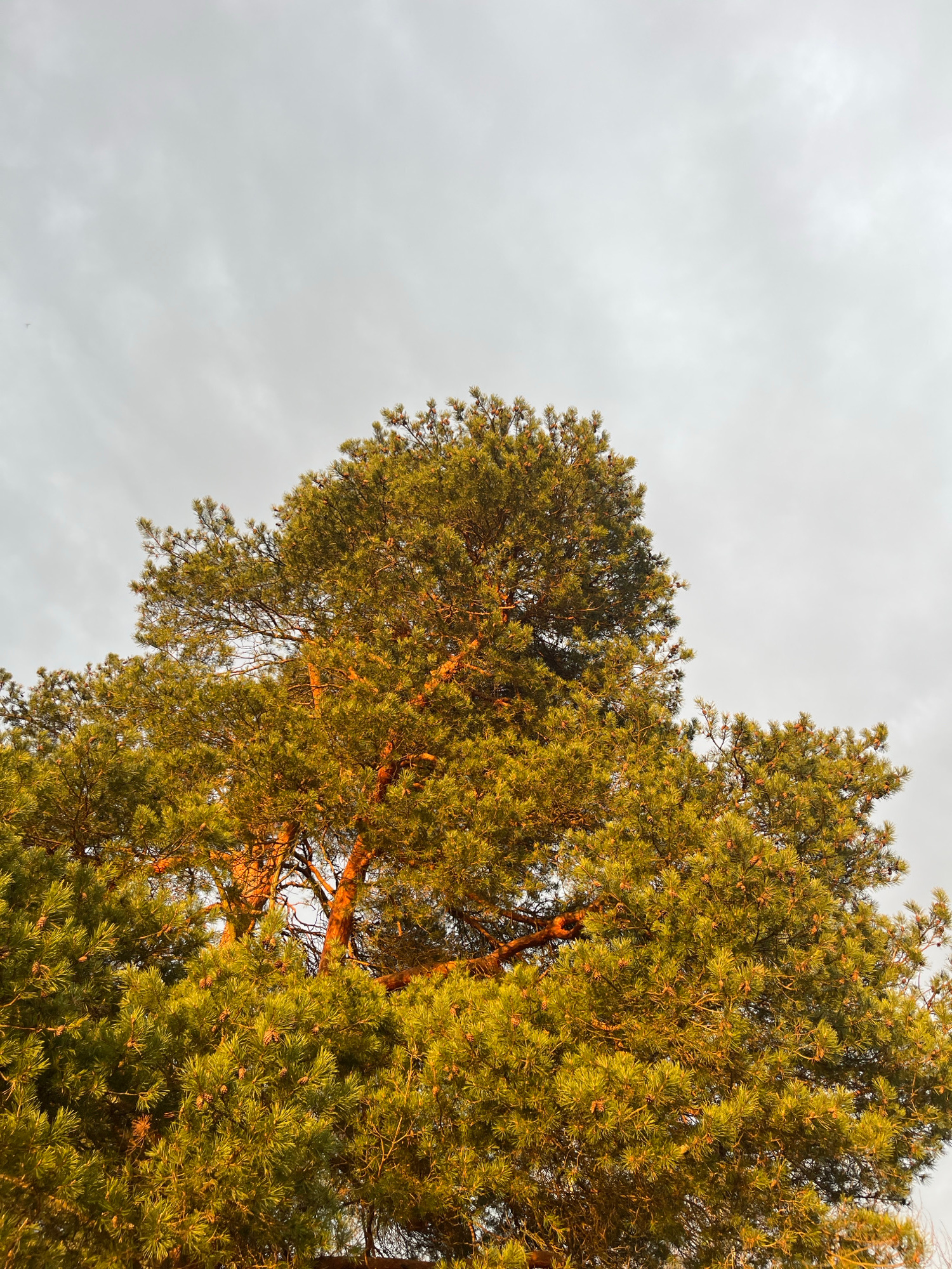 The image captures an upward-looking view of a dense pine tree against an overcast sky. The tree, primarily located on the right and extending into the center and upper parts of the frame, displays ab…read more