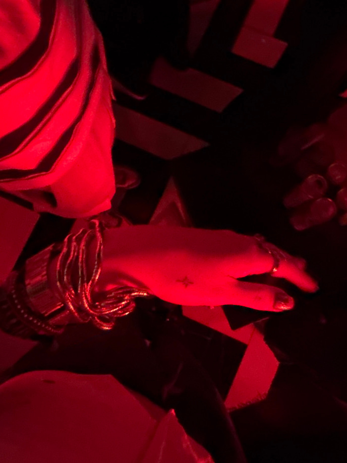 Under red lighting, a person's hand is prominently displayed. They wear multiple gold bracelets and a ring. A small star tattoo is visible on the back of their hand. The background features a black an…read more