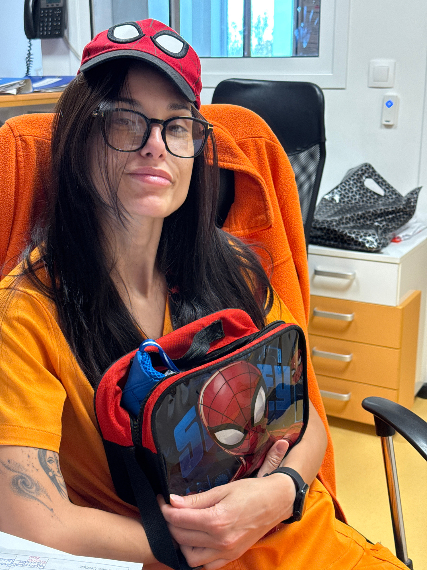 The photograph depicts a woman indoors, likely seated in an office setting. She is wearing a red cap with a Spider-Man design and large, round black glasses. She is also wearing an orange shirt and an…read more
