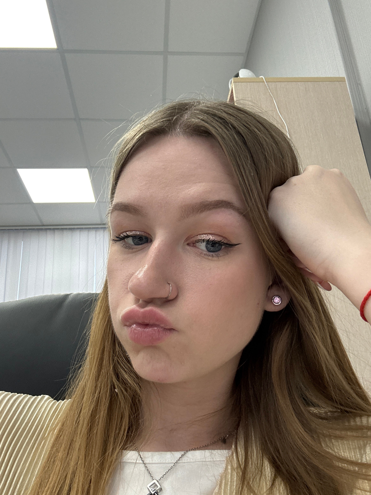 A woman with long, light brown hair is looking directly at the camera. She has fair skin, blue eyes, and is wearing makeup, including eyeliner. She has a small nose ring and a stud earring. Her hand r…read more