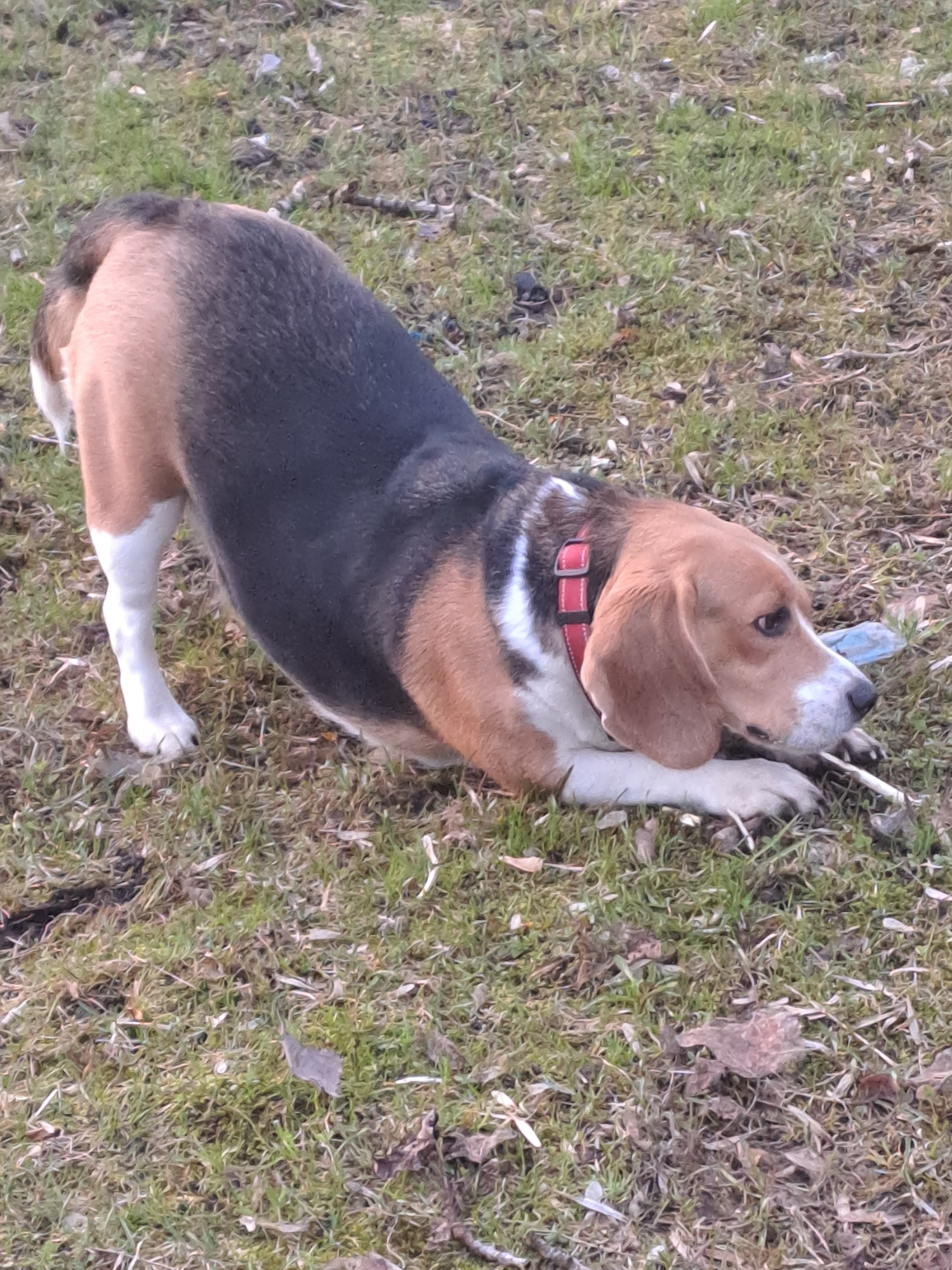 A beagle dog lies on its back on a grassy surface that appears to be lawn. The dog has a red collar. The beagle is chewing on a small, blue object. The location is a grassy area in an outside environm…read more