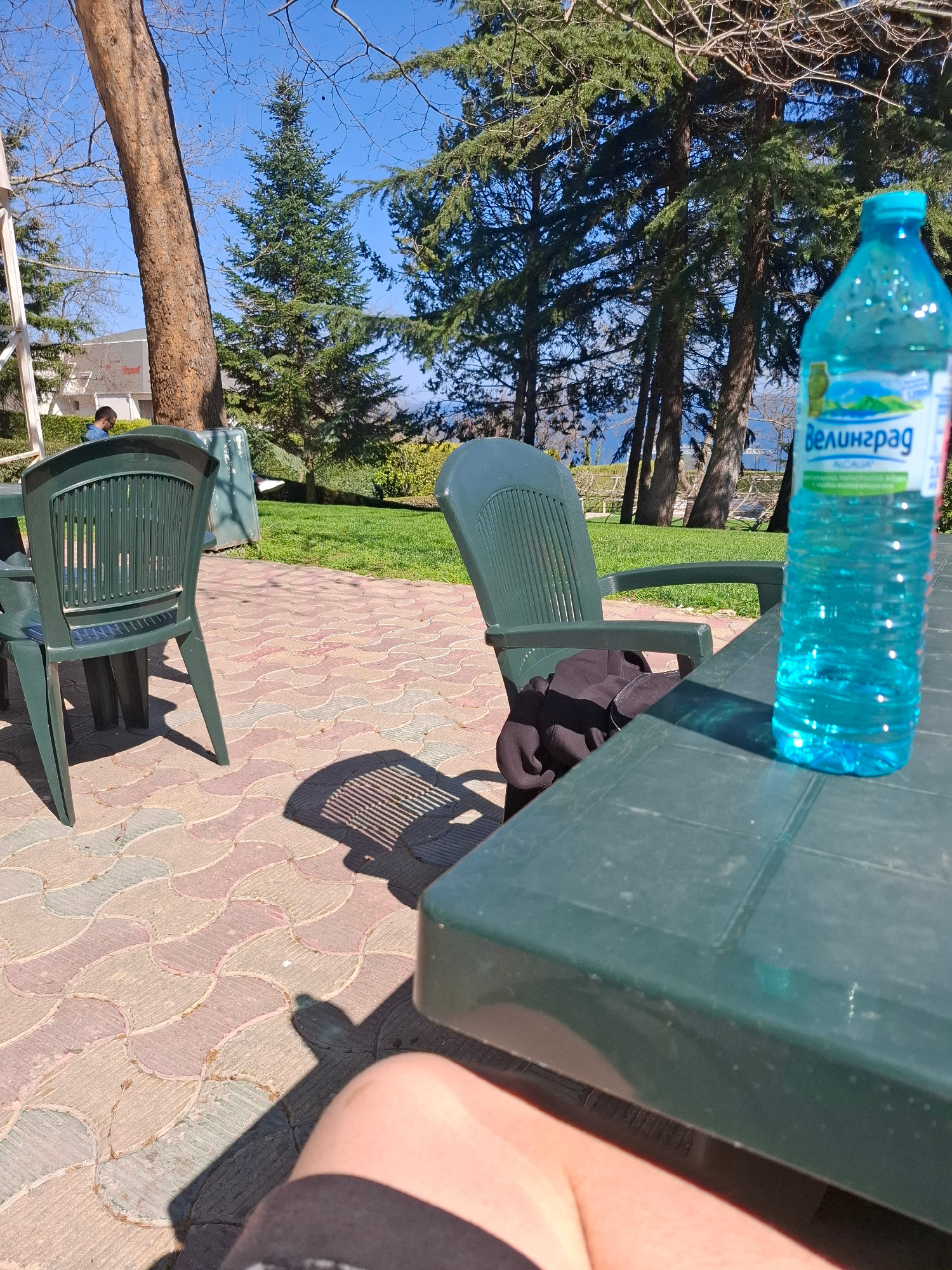 The image shows a green plastic table with a bottle of "Велинград" mineral water on it. There's a green plastic chair at the table, and another similar chair nearby. The ground is paved with patterned tiles. A person's leg is visible next to the table. The background features trees and a blue sky. The scene appears to be outdoors, possibly in a park or garden setting. Without further context, it is challenging to establish that the location is specifically in the city of Varna, Bulgaria, or even to determine with certainty what is the exact location within Varna, without further cues. | Open Wire