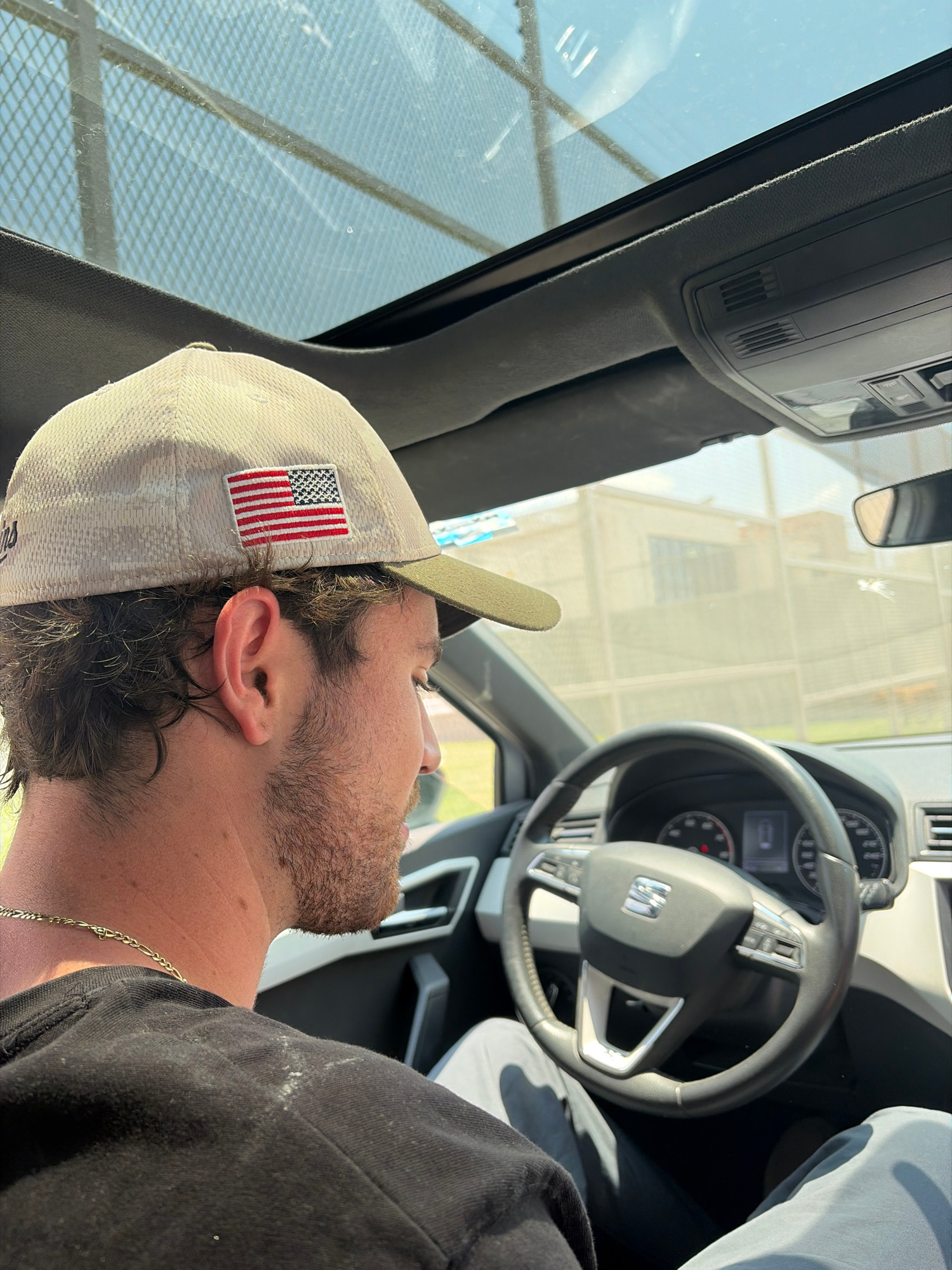 The image shows a man in the driver's seat of a car. He is wearing a light-colored baseball cap with an American flag patch, and a black shirt. A gold chain is visible around his neck. The car's steerβ¦read more