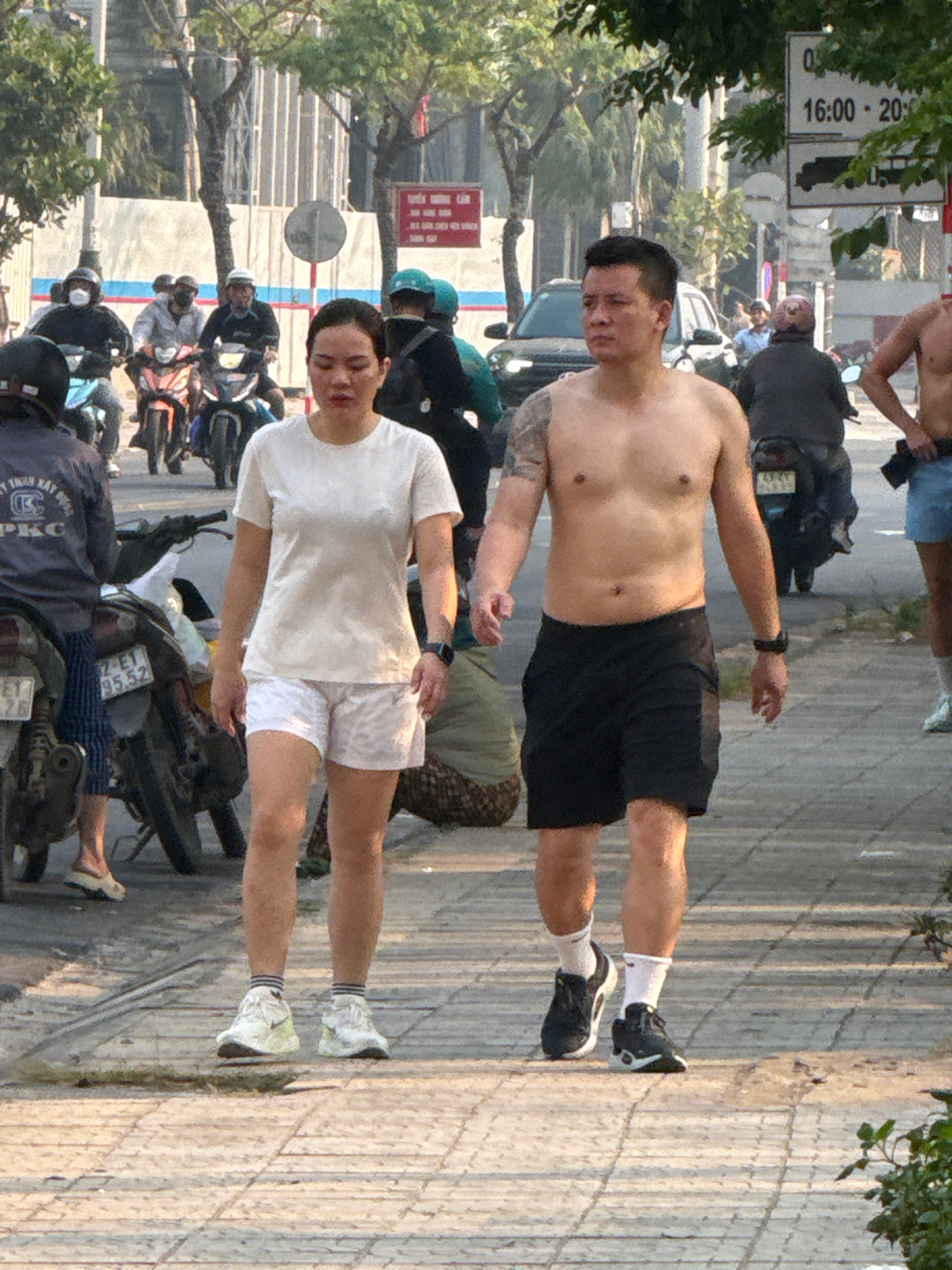 On a paved sidewalk in what appears to be Đà Nẵng, Vietnam, stands a shirtless man in black shorts, black athletic shoes, and white socks. Next to him is another man in a white t-shirt, white shorts,…read more