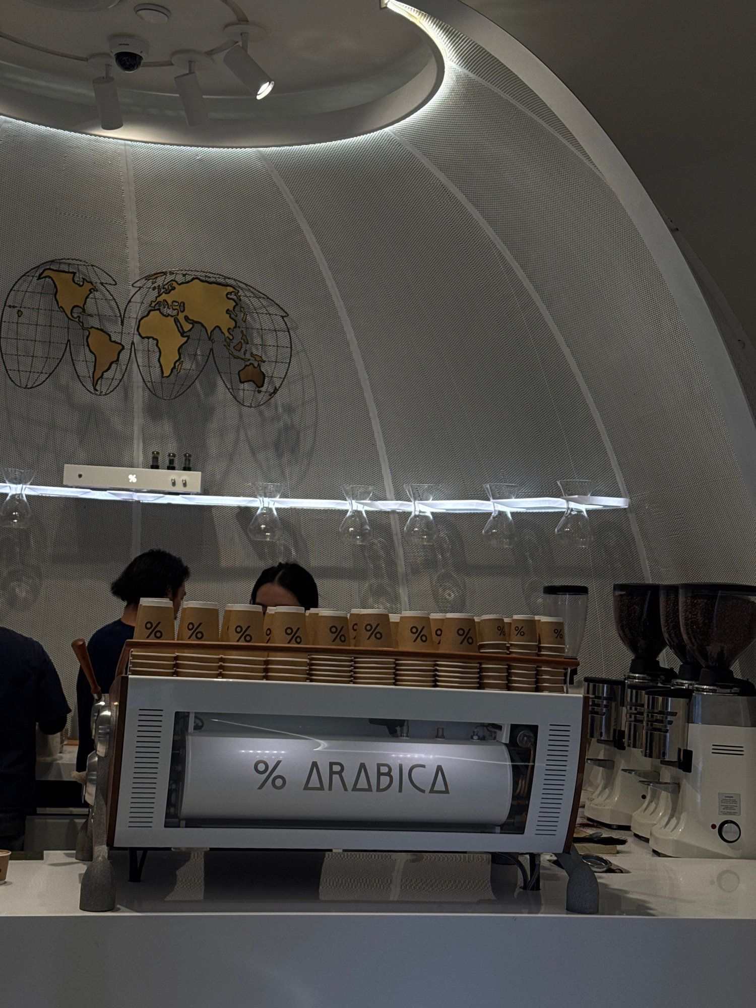 A high-angle, close-up shot inside a % Arabica coffee shop, possibly the location in Whistler, Canada. The left side of the frame displays a curved, illuminated ceiling with a fine mesh design, adorneβ¦read more