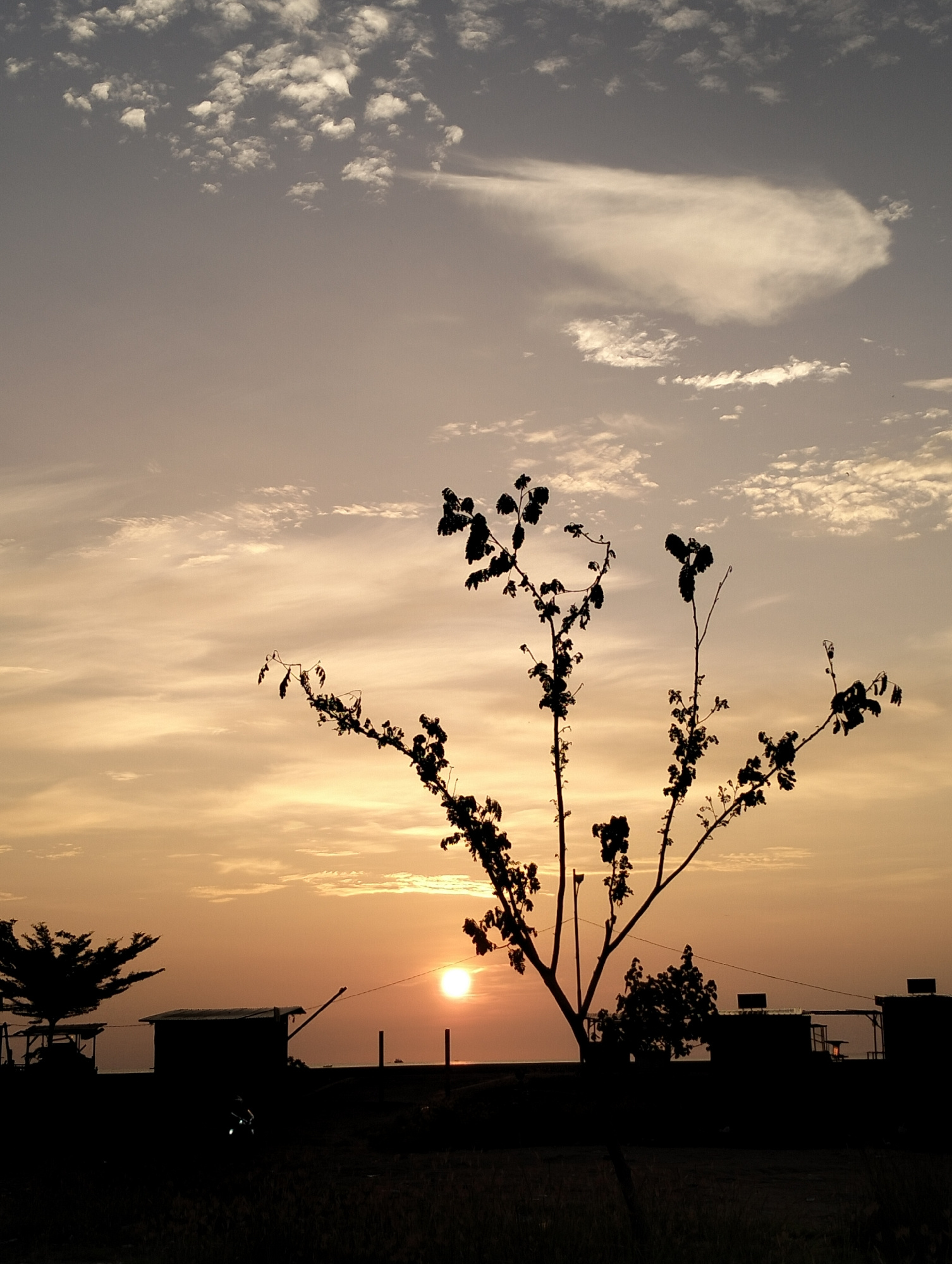 The image depicts a sunset in Lhokseumawe, Indonesia. The sky is a gradient of colors from orange near the horizon to pale grey-blue overhead, with clouds scattered throughout. A silhouetted tree with…read more