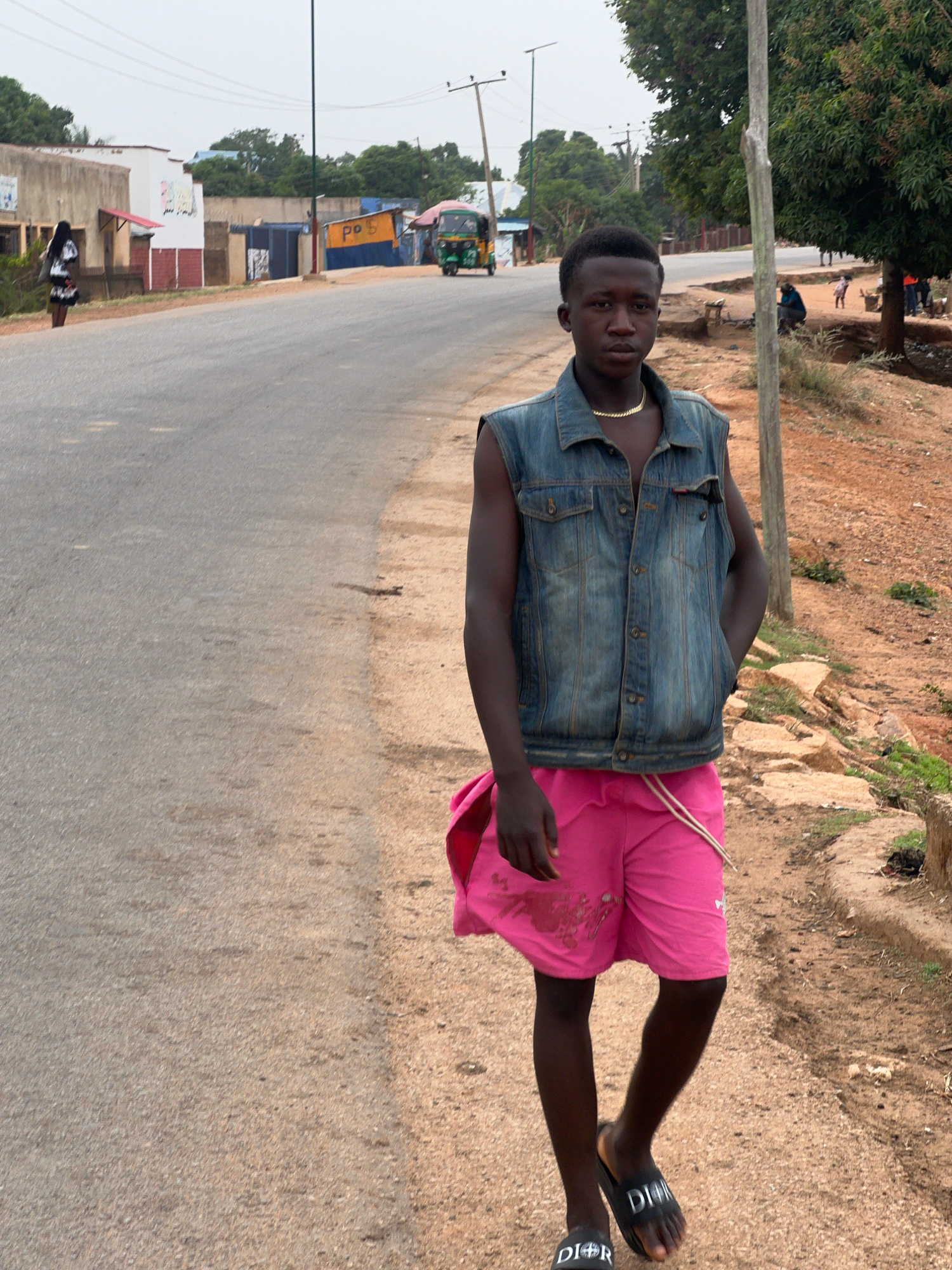 A person stands on the side of a road. They are wearing pink shorts, a blue denim vest, and black sandals with white "DIOR" logos. The person has dark skin and short hair. In the background, a road st…read more