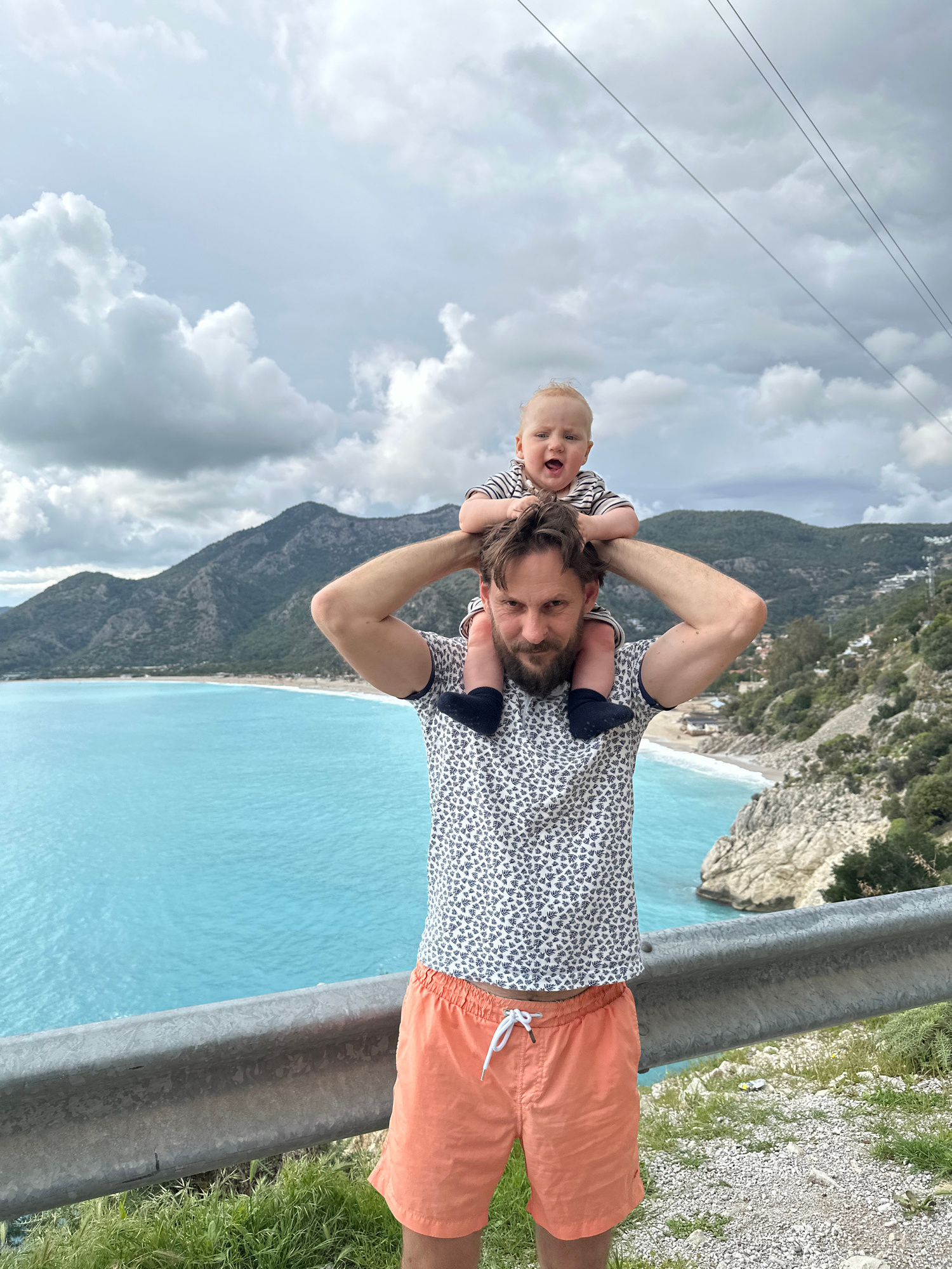 A man with a beard stands beside a metal guardrail with a baby on his shoulders. The man wears a printed short-sleeved shirt and orange shorts. The baby wears a black and white striped shirt. The back…read more