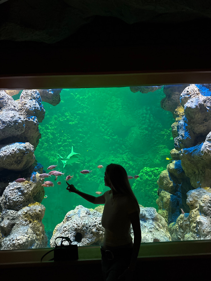 The image depicts an indoor scene at The National Aquarium Abu Dhabi, United Arab Emirates, featuring a large marine exhibit. A single female subject is observed in silhouette against the brightly ill…read more
