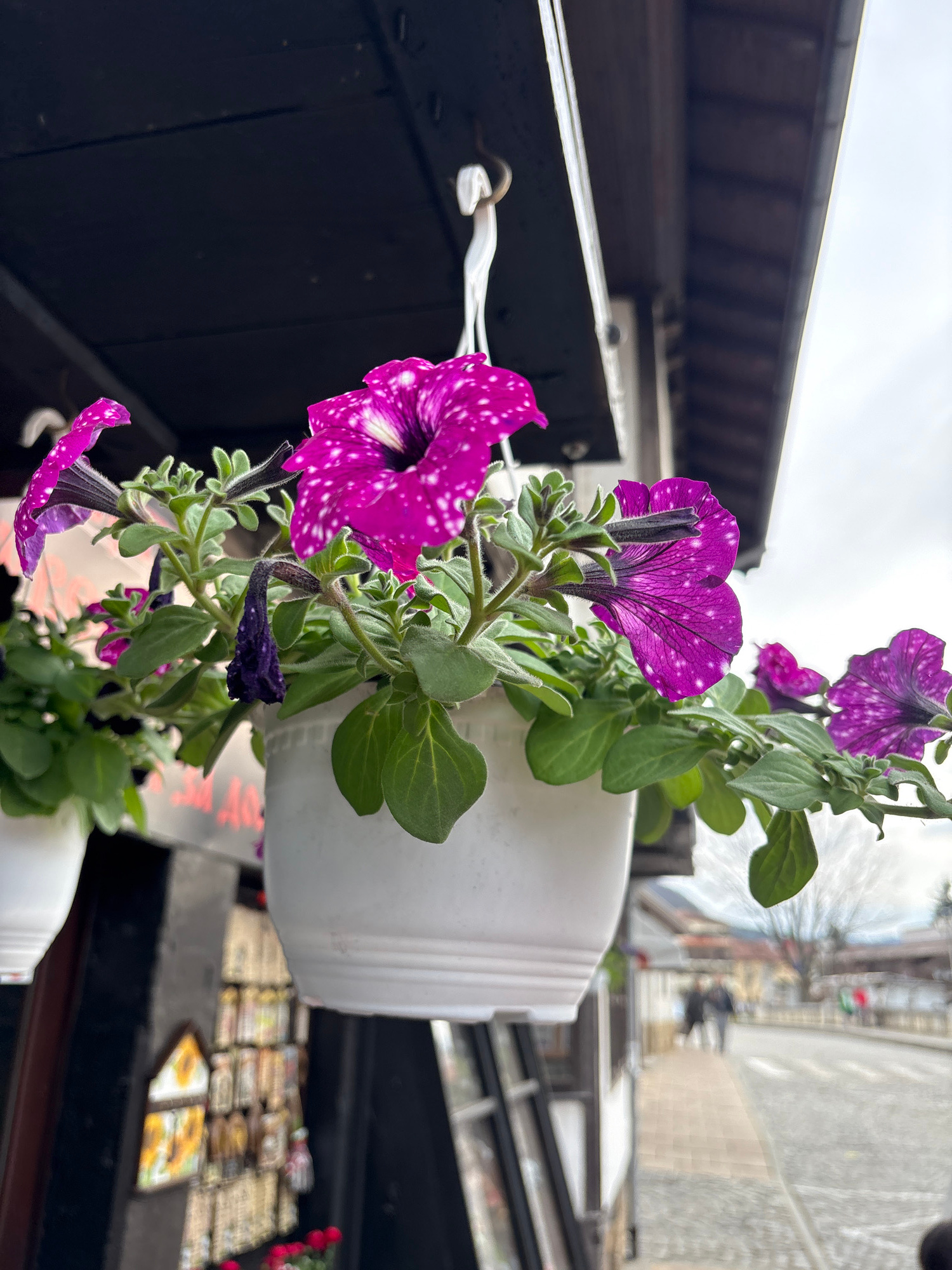 The image shows a close-up view of a white plastic flowerpot containing purple petunia flowers with white speckles. The pot is attached to a dark, possibly wooden, structure. In the background, a blur…read more