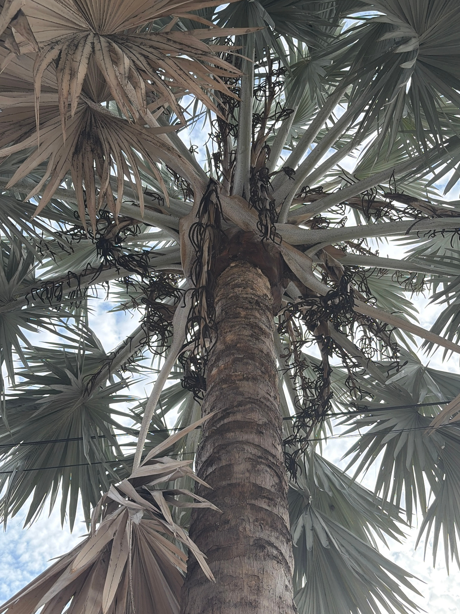 The image captures a worm's-eye view looking directly up into the canopy of a large palm tree, likely in Ciudad Guayana, Venezuela. The thick, textured trunk of the palm tree dominates the right side…read more