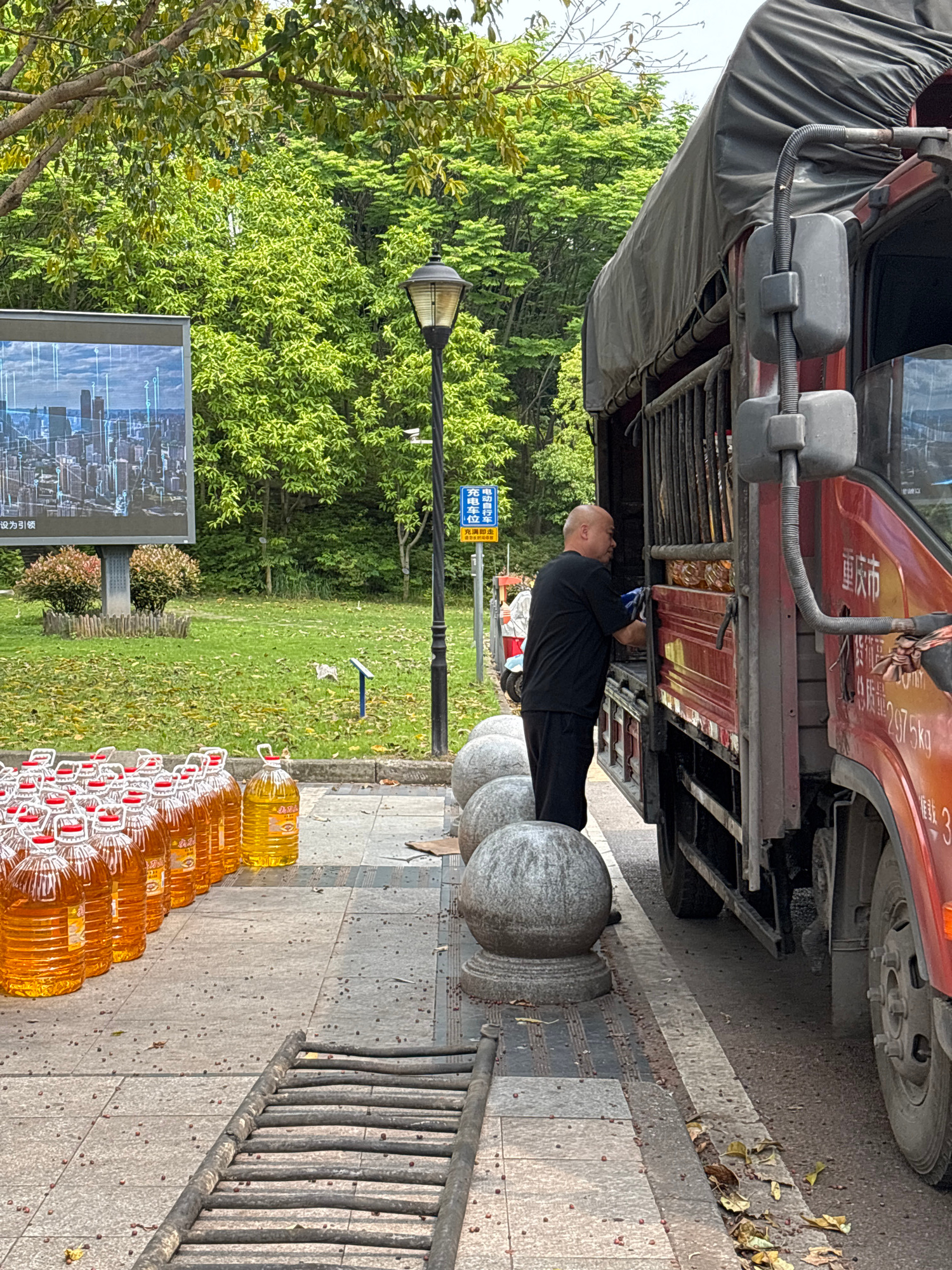 The image depicts a street scene in Jiangjin, China. A bald man in black clothing is standing beside a red truck, appearing to work on its underside. The truck is parked on a sidewalk alongside a row…read more