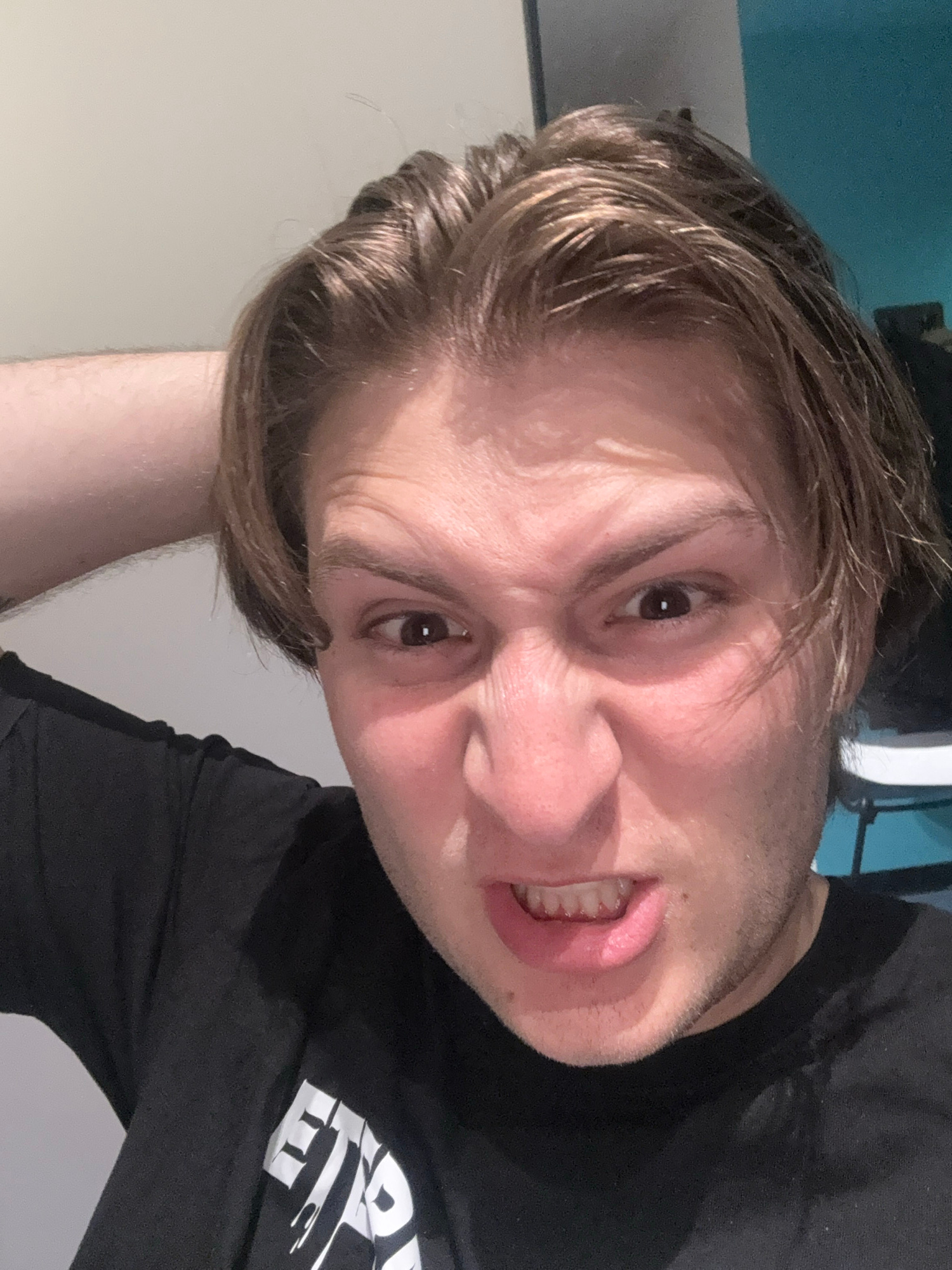 The image is a selfie of a light-skinned male with brown hair, wearing a black t-shirt with white text. He is looking directly at the camera with a grimacing expression, showing his teeth. His right a…read more