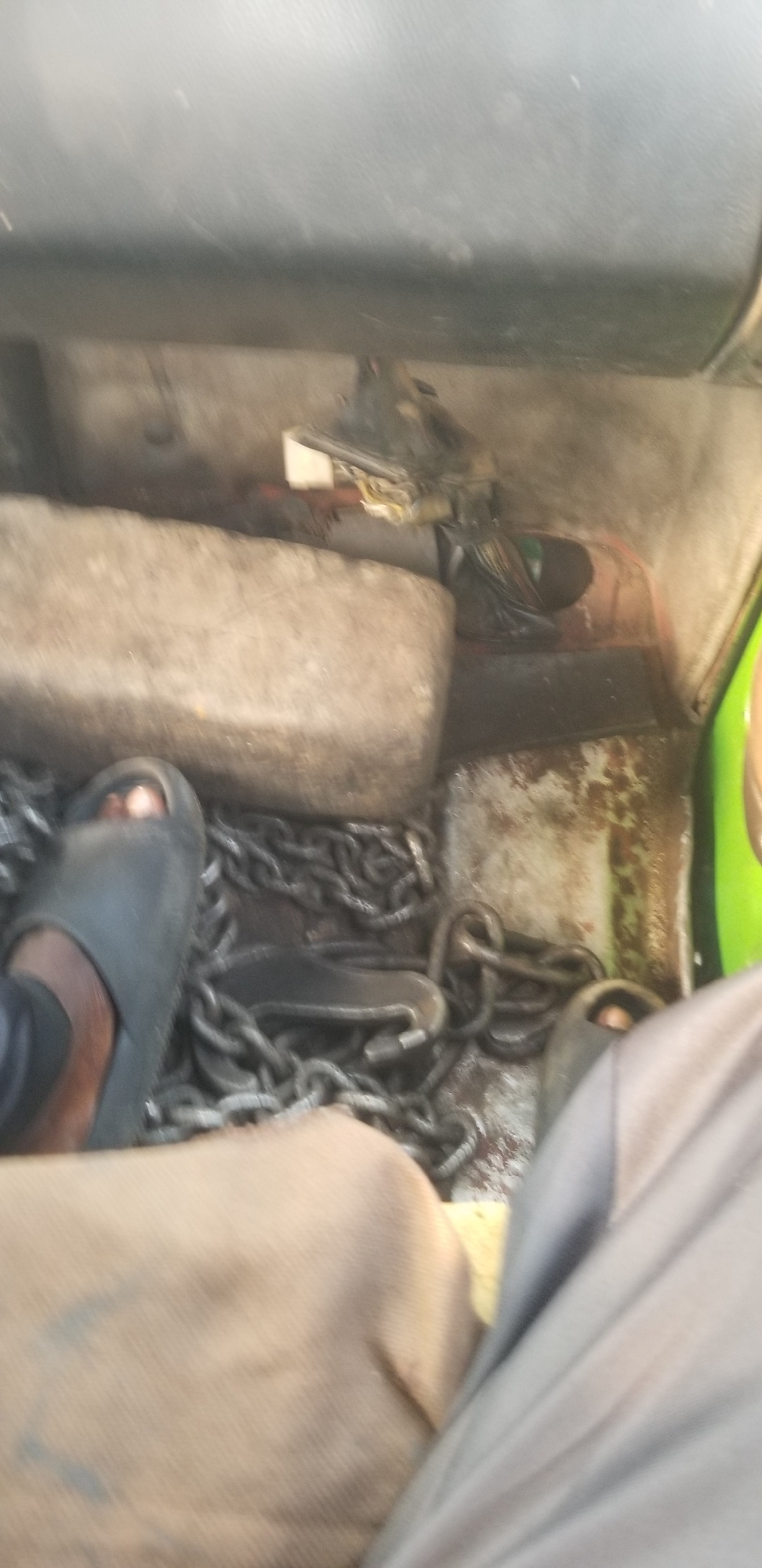 The image shows the cluttered storage area inside a vehicle, possibly a truck or van, in Asa Umu Nka, Nigeria. A foot wearing a dark grey sandal rests on top of a pile of heavy, grey metal chains. Nex…read more