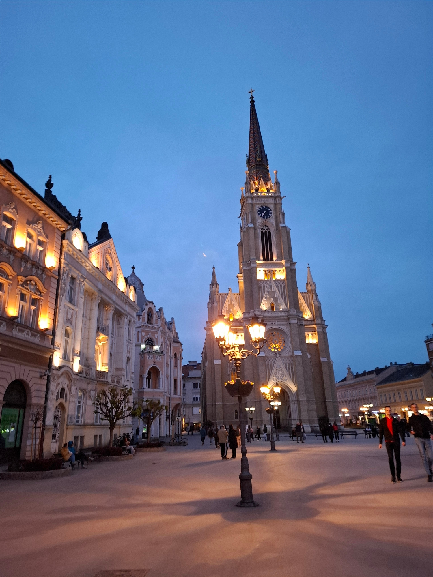 The image shows an evening view of buildings in Novi Sad, Serbia, with illuminated architectural details against a darkening blue sky. The prominent structure is the Name of Mary Church, featuring a t…read more