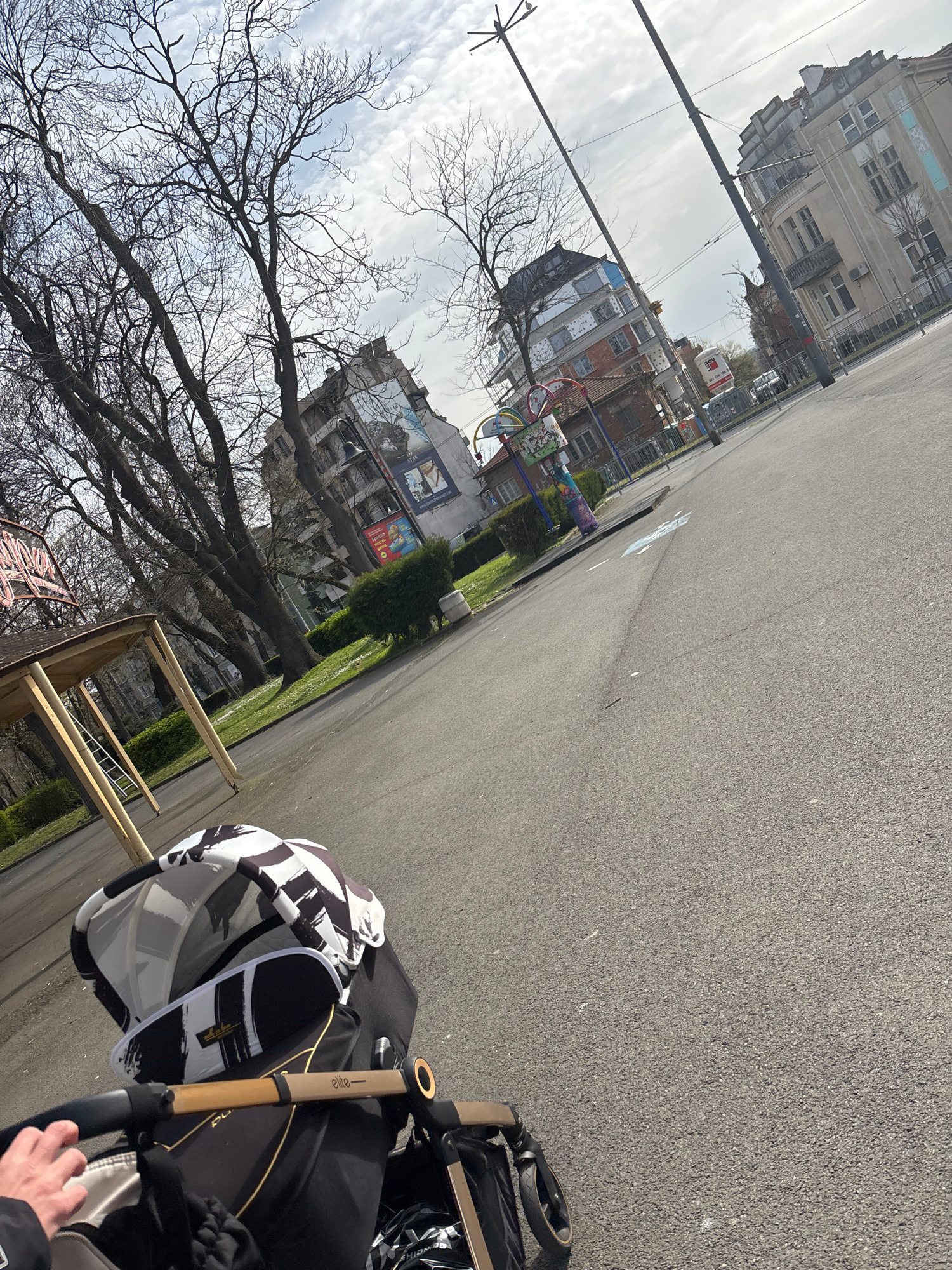 A street view in Burgas, Bulgaria, shows buildings with graffiti and advertising. Bare-branched trees frame the left side of the frame. The foreground depicts a stroller with a black and white pattern…read more