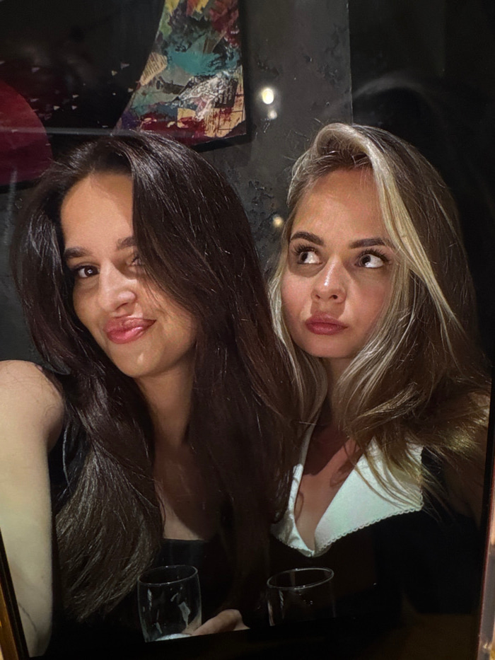 Two young women are reflected in a glossy black surface, possibly a table. The blonde woman at the top has light blonde hair with darker roots and wears a white top. Her eyes are wide, and she appears…read more