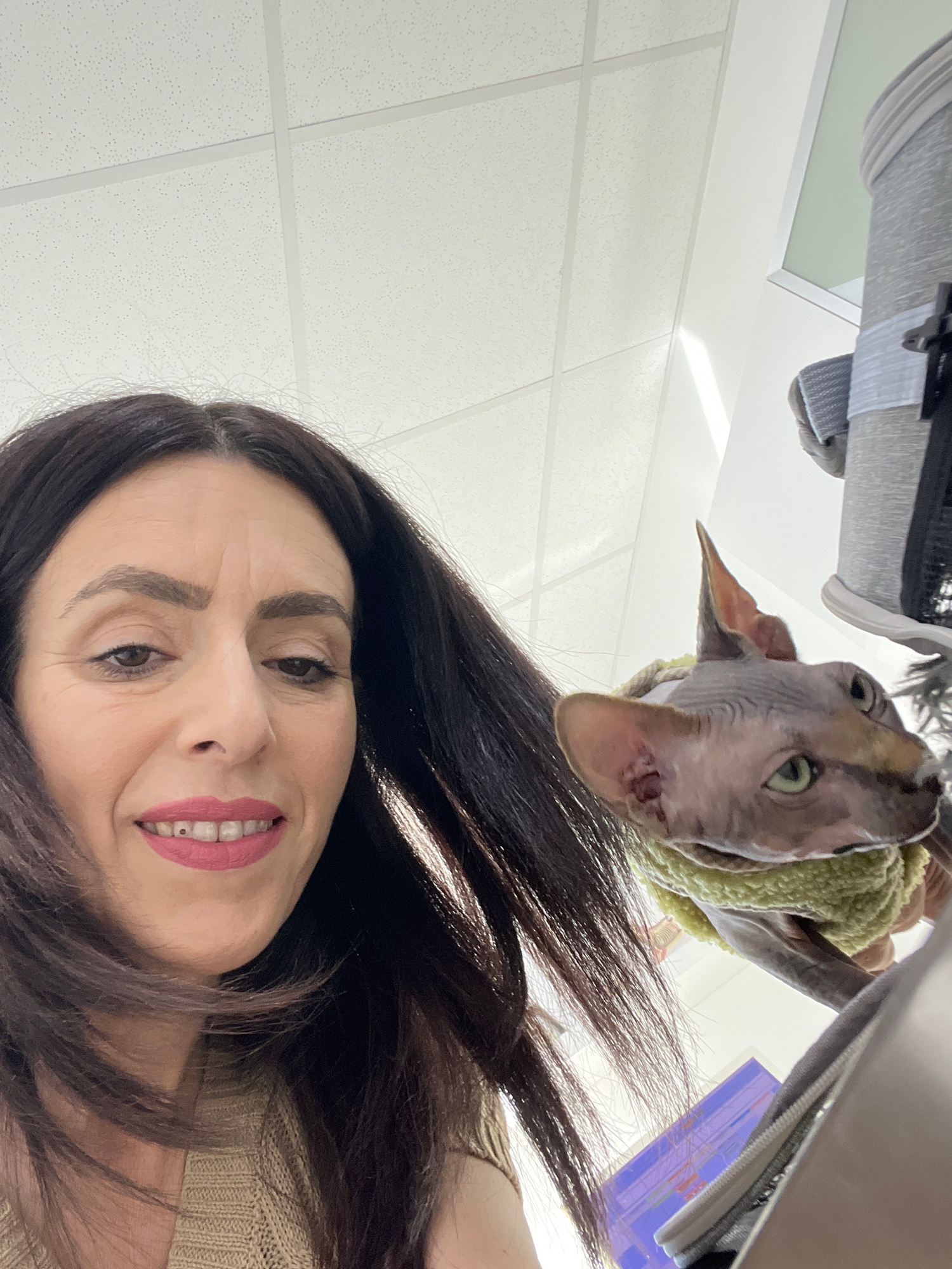 This image is a low-angle selfie featuring a smiling woman and a Sphynx cat in an indoor setting, located in Wasserliesch, Germany. The woman, with long dark hair and red lipstick, is positioned in th…read more