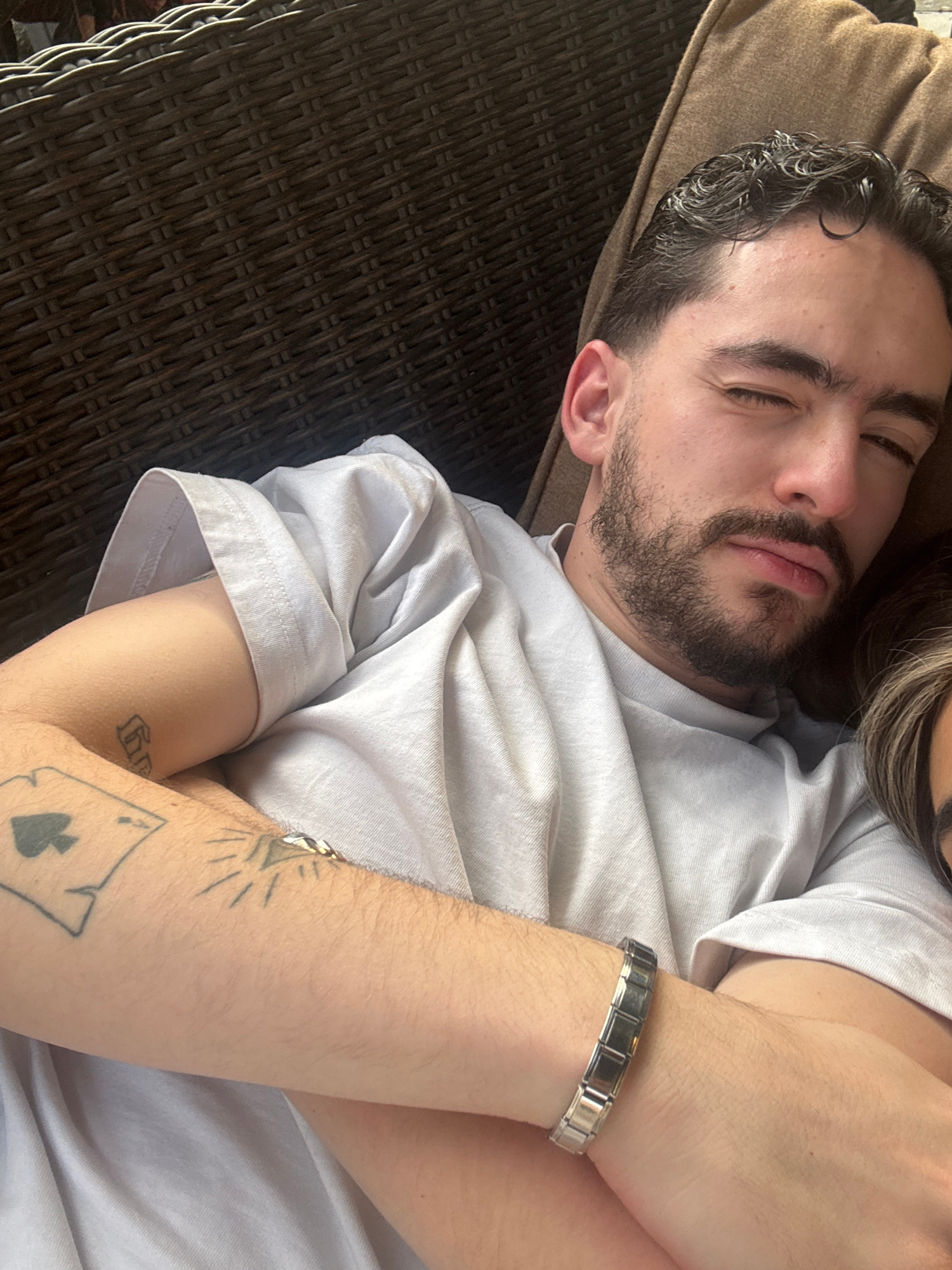 A man with a beard is lying down, possibly asleep. He is wearing a white t-shirt and has a silver bracelet on his wrist. Tattoos are visible on his arm. He is resting on a cushion that appears to be o…read more