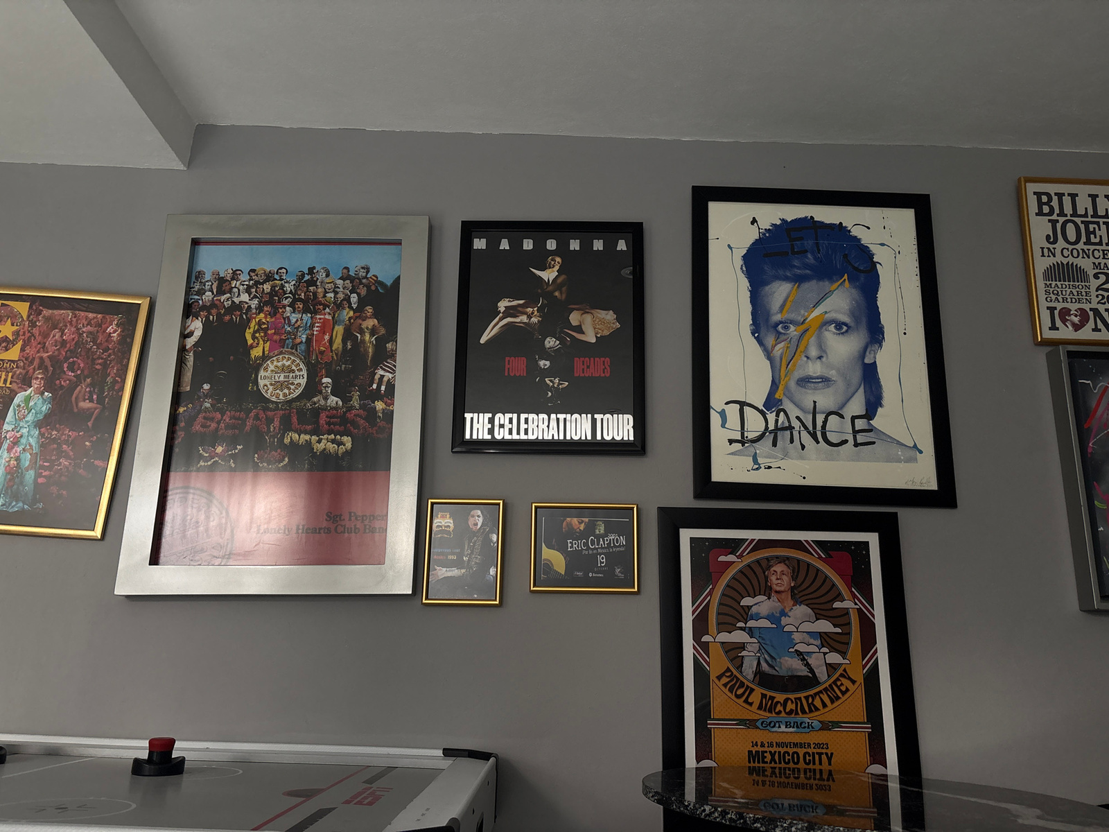 A collection of framed posters and memorabilia is displayed on a gray wall. The posters are arranged in a somewhat asymmetrical grid, with the largest poster on the left featuring The Beatles' "Sgt. P…read more