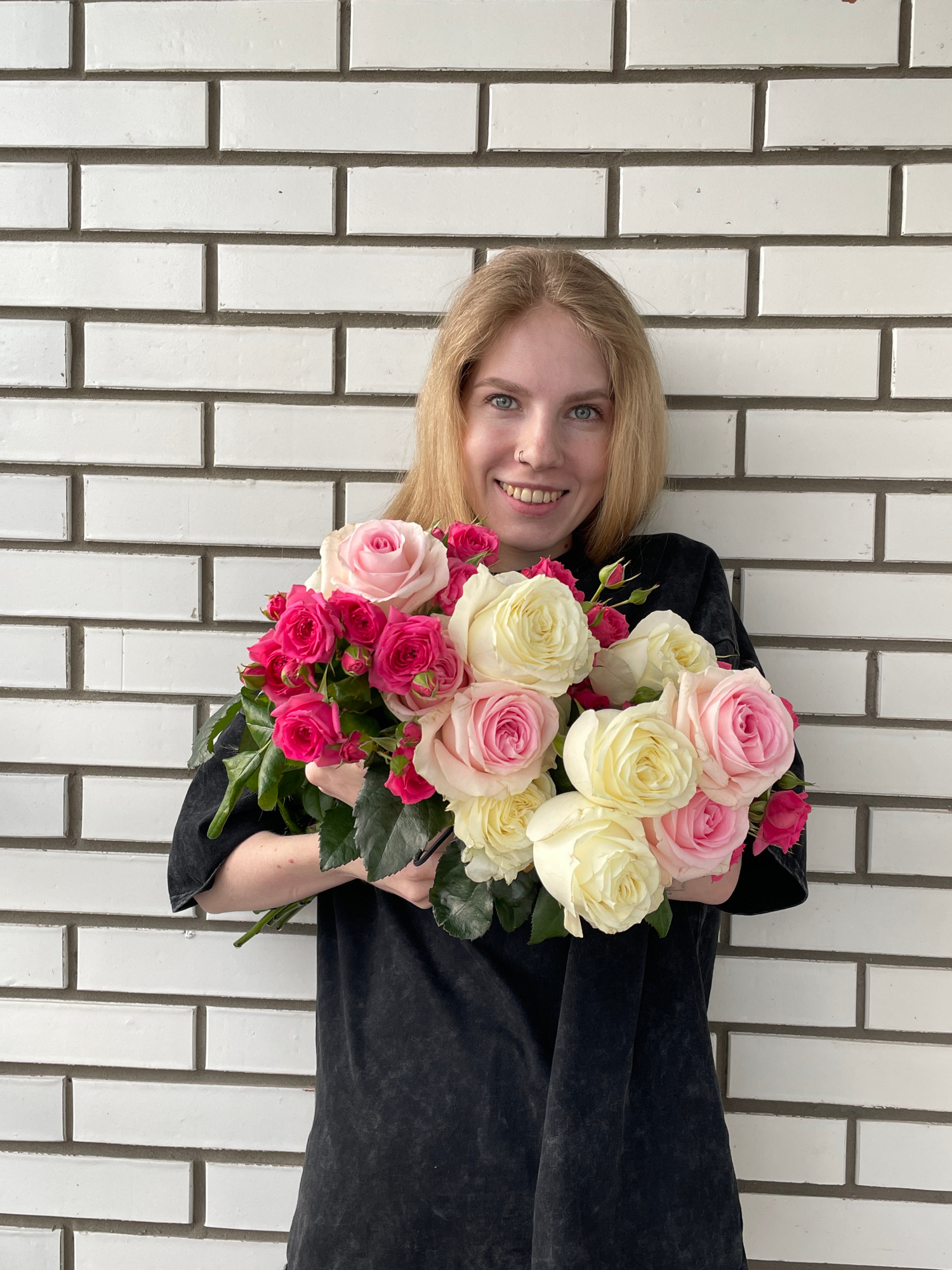 A smiling young woman with fair skin and blonde hair is holding two bouquets of flowers in front of a white brick wall. The flowers are a mix of light pink, dark pink, and cream-colored roses. She is…read more