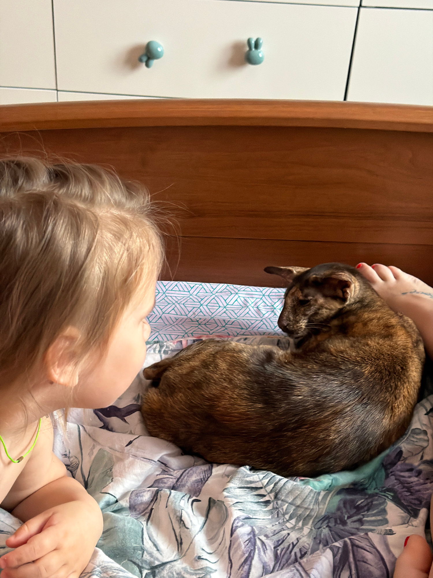 A young child lies on a patterned bedsheet looking up at a tabby cat that is situated beside the child's head. The child is fair-haired and wears a green necklace. The cat is curled into a donut shape…read more