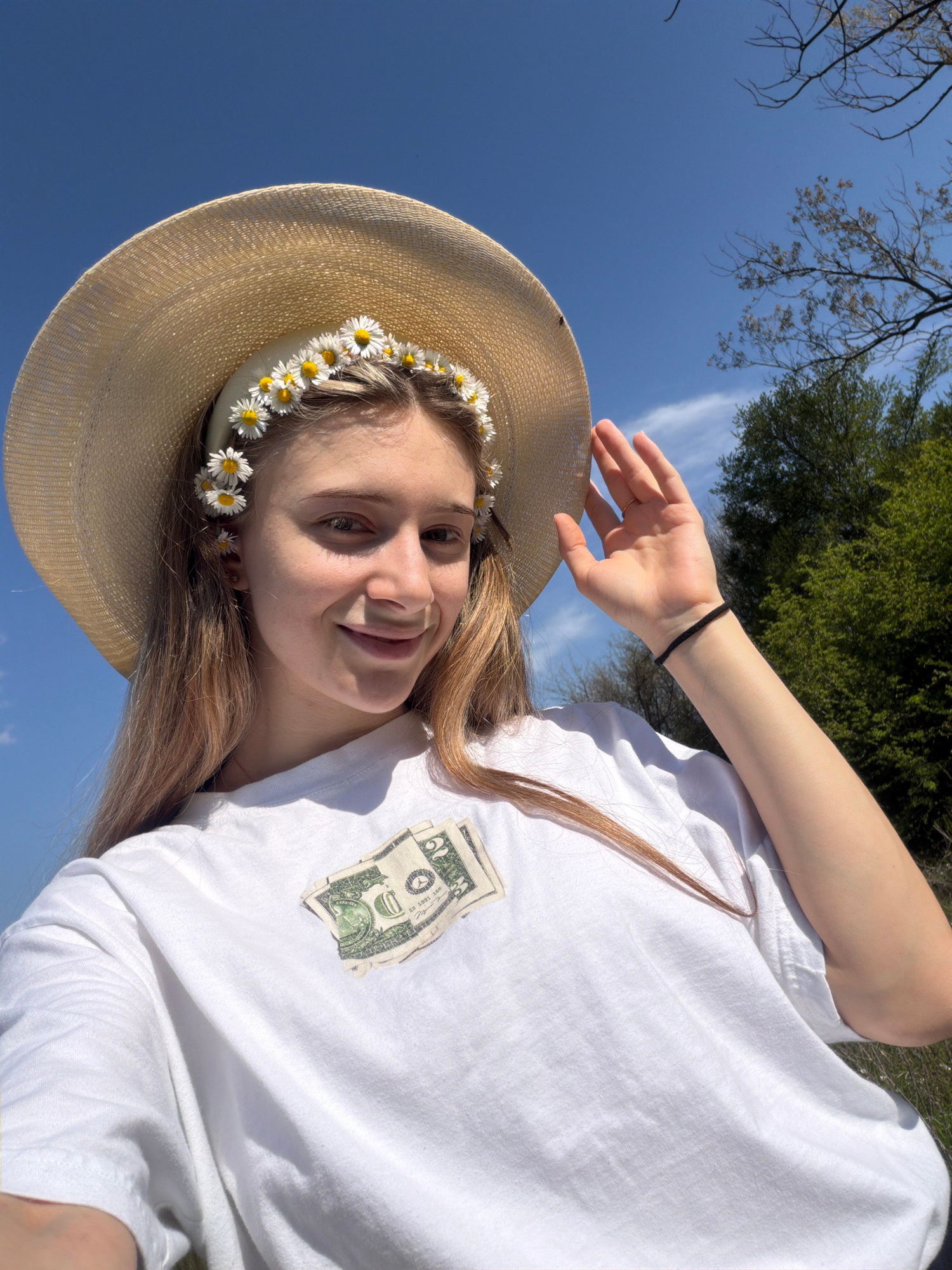 A young woman is depicted in a selfie taken outdoors under a sunny blue sky. She wears a straw hat adorned with small daisies and a white T-shirt with two dollar bills attached to the upper right ches…read more