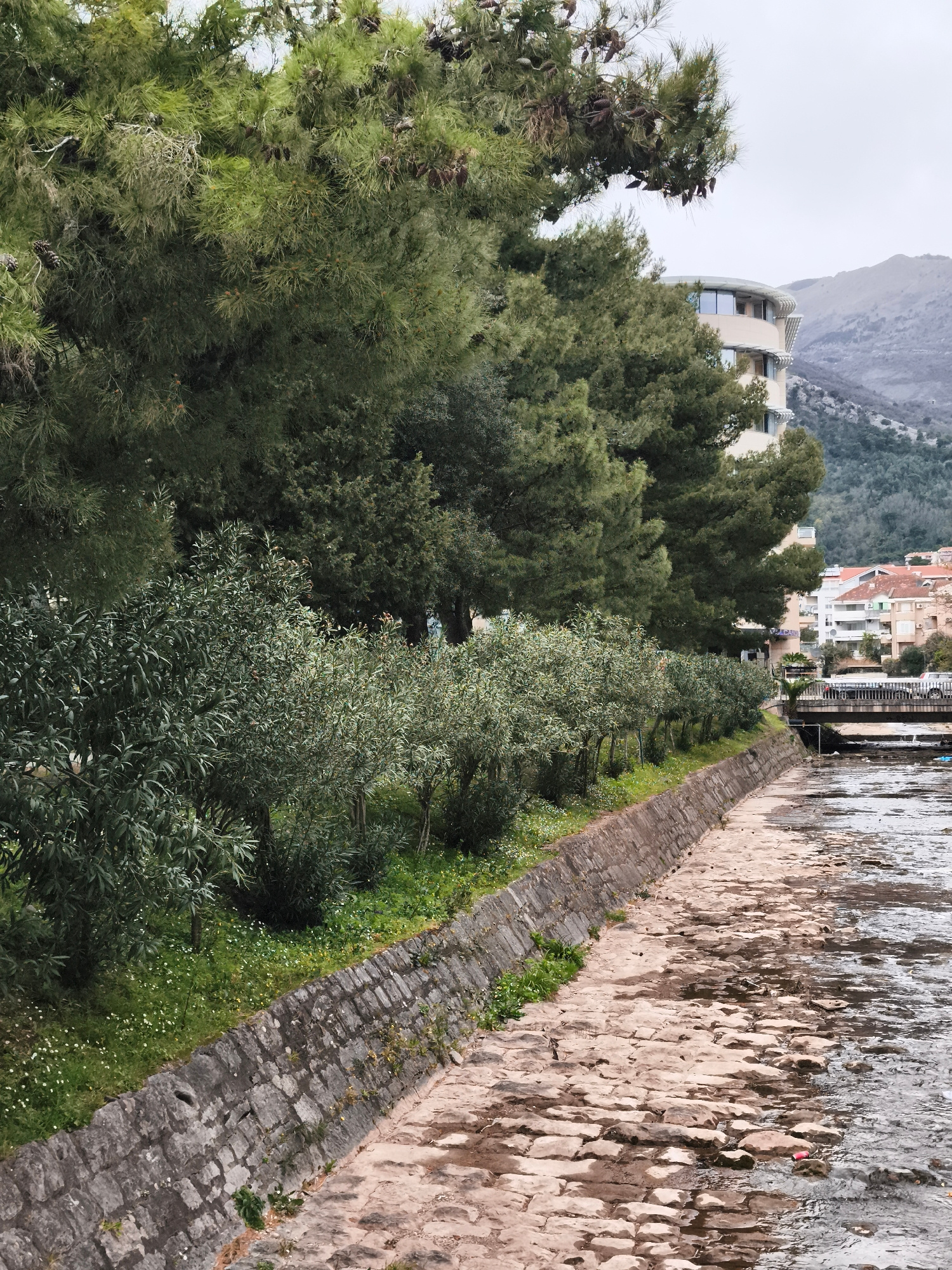 The image shows a canal running through Budva, Montenegro. The canal bed is made of uneven stones, and the water level is low, exposing much of the stone bed. The canal is bordered by a stone wall, ab…read more