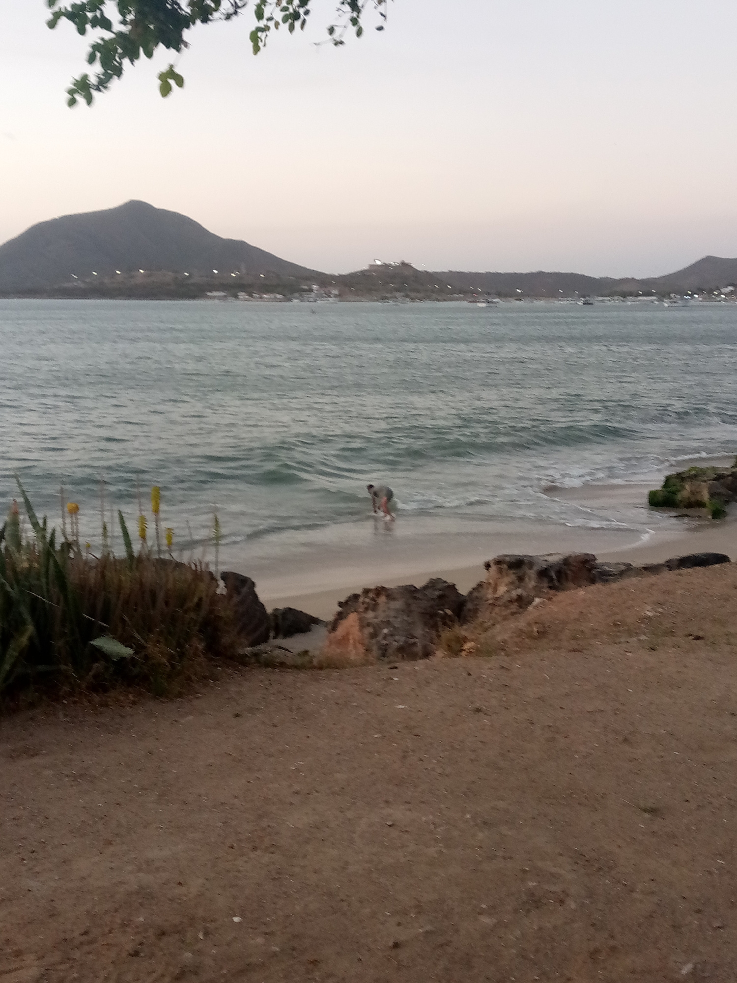 The image depicts a beach scene in Juan Griego, Venezuela. In the distance, there is a large mountain with buildings along its base. In the water, there is an individual bent over, appearing to be intβ¦read more