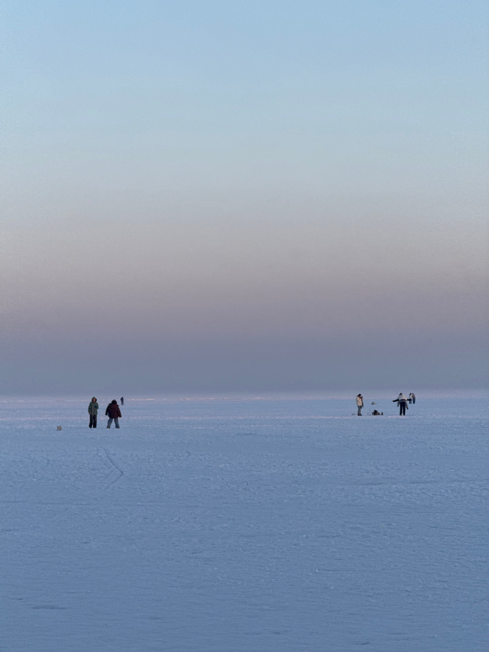 The image displays a vast, flat, snow-covered landscape, characteristic of a frozen body of water, situated in Liutizh, Ukraine. The sky transitions from a pale blue overhead to a muted purple-grey at…read more